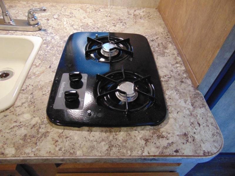 - Two-burner stove, microwave, and refrigerator make meal prep simple and convenient.