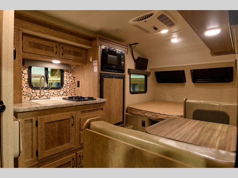 Along the curb side wall you can eat meals on the booth dinette as well as make this space an extra sleeping area for one at night. On the opposite side you will find a single sink, two burner cooktop, refrigerator, microwave, and overhead storage in the single slide out.