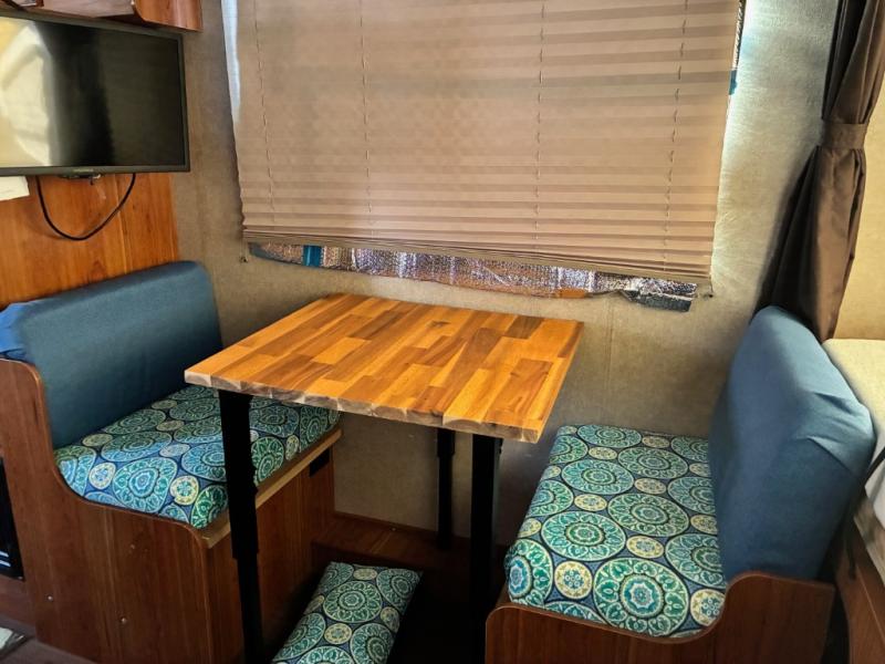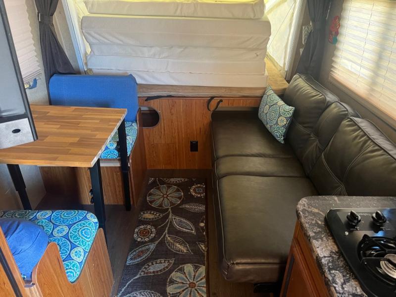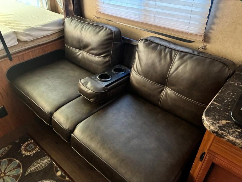 Further into the unit you will find a booth dinette and a sofa with overhead storage on the opposite side. Both can be used for additional sleeping space if needed.
