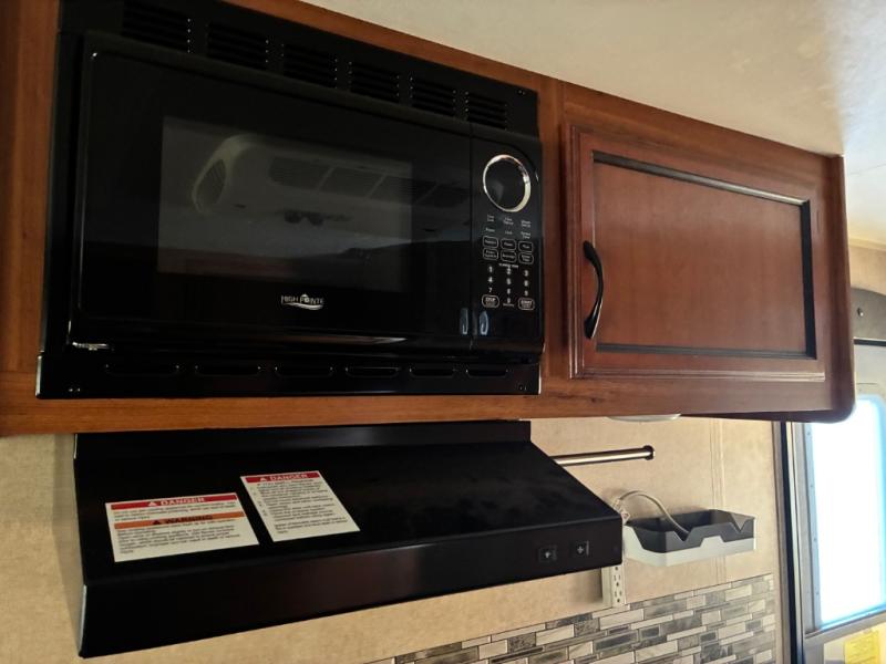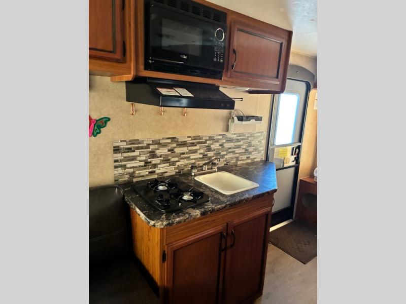 To the right of the entry door there is a sink with a 2 burner cook-top and microwave oven including overhead storage. Opposite the sink and stove are a refrigerator and furnace.