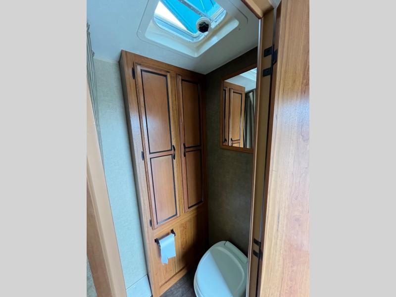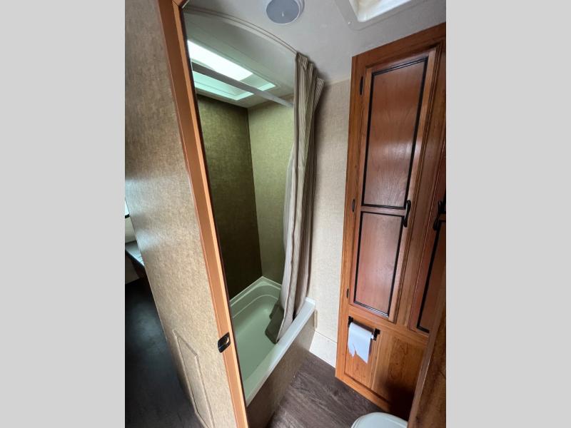 As you step inside you will see a full bed up front with overhead cabinet for storage. Next to the bed is a convenient bath featuring a tub/shower, toilet, and linen cabinet.
