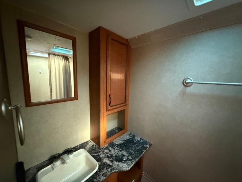 To the left of the entry door you will find a dinette with an overhead cabinet. Here you can enjoy your meals, and at night you can use this area for a smaller bed. Along the opposite side of the trailer is the kitchen area. Here you will find a sink, two burner range, microwave, overhead cabinet for dishes, a refrigerator, and a pantry.