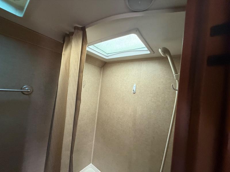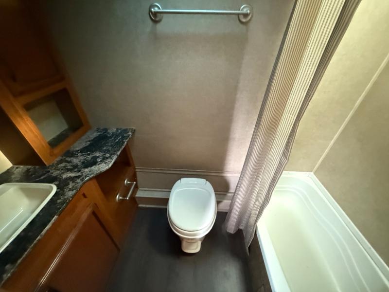 The rear bathroom features a tub/shower, toilet, sink, and corner shelves.
