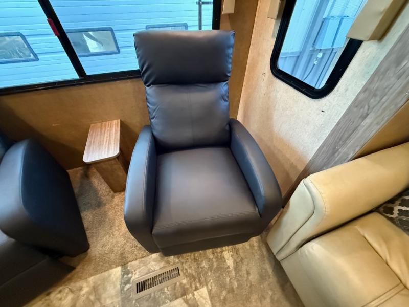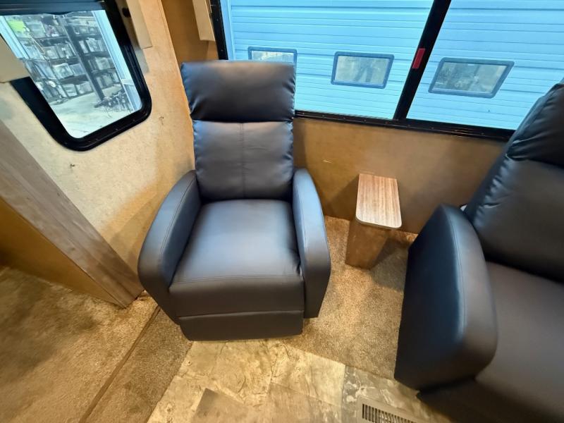 Along the rear wall there are two lounge chairs, or you can choose recliners if you wish. There is an end table between the two, and overhead cabinets that stretch the width of the unit. For your meals you can dine comfortably at the booth dinette found within the curb side slide. You will also find an entertainment center here to enjoy.