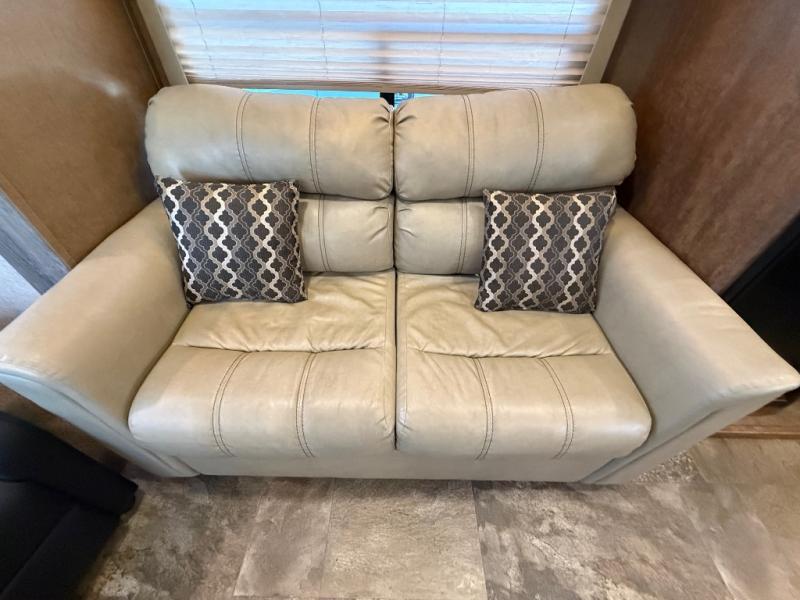 Step inside and notice the kitchen area straight ahead. There is a double sink, plus counter space straight in the door along the interior wall, plus overhead cabinets too. A slide out three burner range and refrigerator make it easy to whip up light meals and snacks for your family. Plus the road side slide also features a hide-a-bed sofa as well.