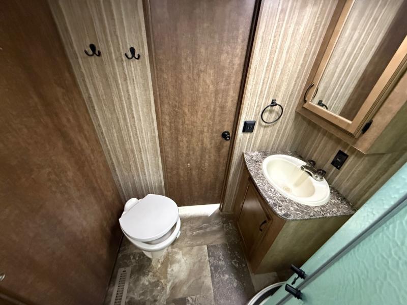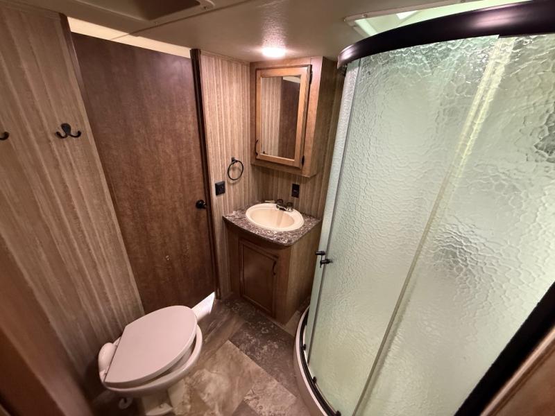 Head up the steps to the right of the main entry and find a side aisle bath including a corner shower, toilet, and vanity with sink on your left. There is a second bath entry door that slides open to allow access to the linen cabinet up front within the master bedroom slide out.