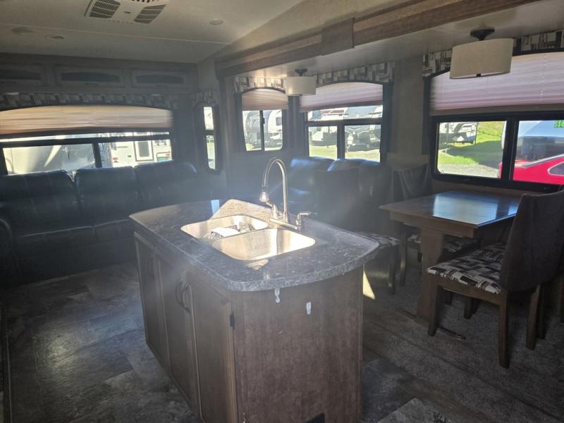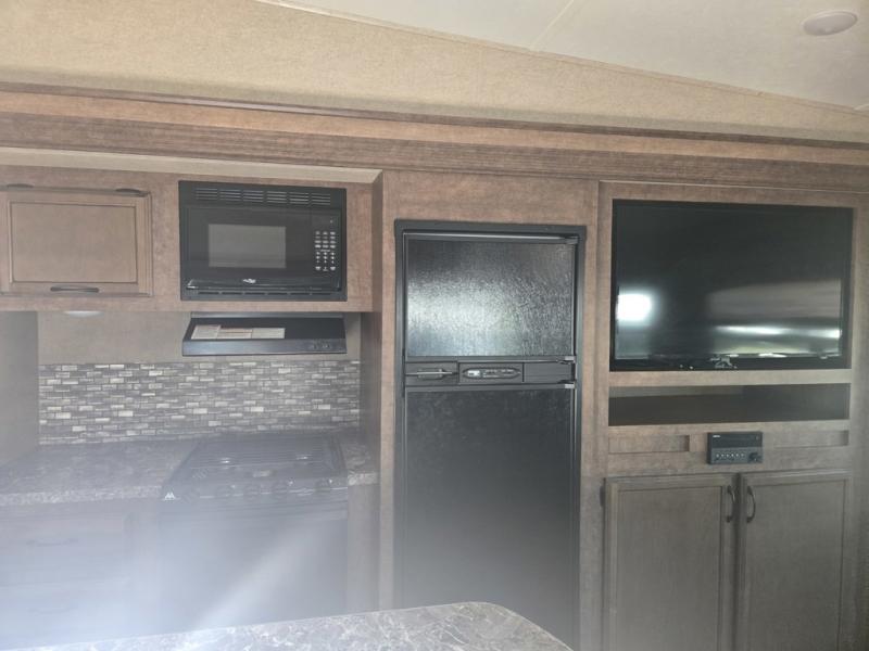 Step inside and take a look around. There is a spacious combined living area that features dual opposing slide outs. The slide along the curb side provides all of your kitchen amenities including a three burner range, overhead microwave oven, and counter space. You will also find a refrigerator and overhead storage within the slide. A pantry can be found along the interior wall straight in the door, plus the convenient kitchen island offers additional prep space and a double sink for cleaning up.