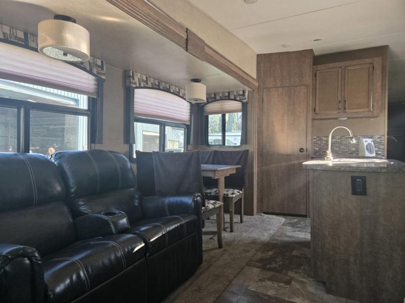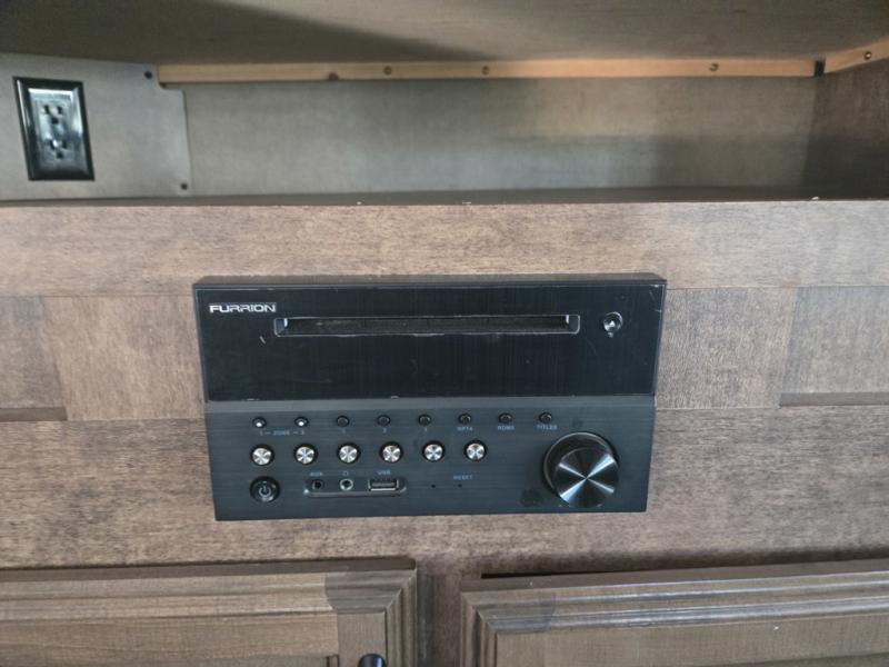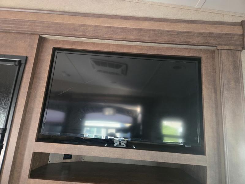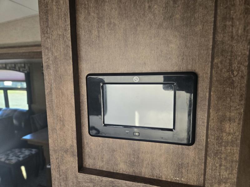 In the rear of this unit relax on the sofa that stretches across this unit. There is plenty of overhead cabinetry for your things, plus additional seating along the road side with a theater seat for two, and a booth dinette for mealtimes and more. Opposite the theater seats is where you will find an entertainment center with flat screen TV to enjoy.