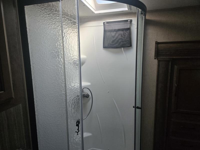 Head up the steps to the right of the main entry and find a side aisle bath including a corner shower, toilet, and vanity with sink. The second bath entry door slides open to allow access to the linen cabinet up front in the master bedroom slide out.