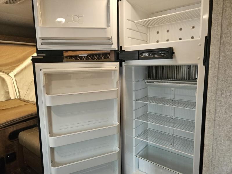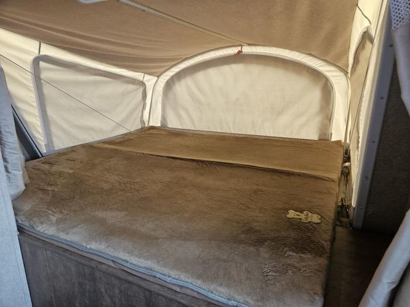 To the right is a large overhead shelf and a front king size expandable tent end bed for sleeping.