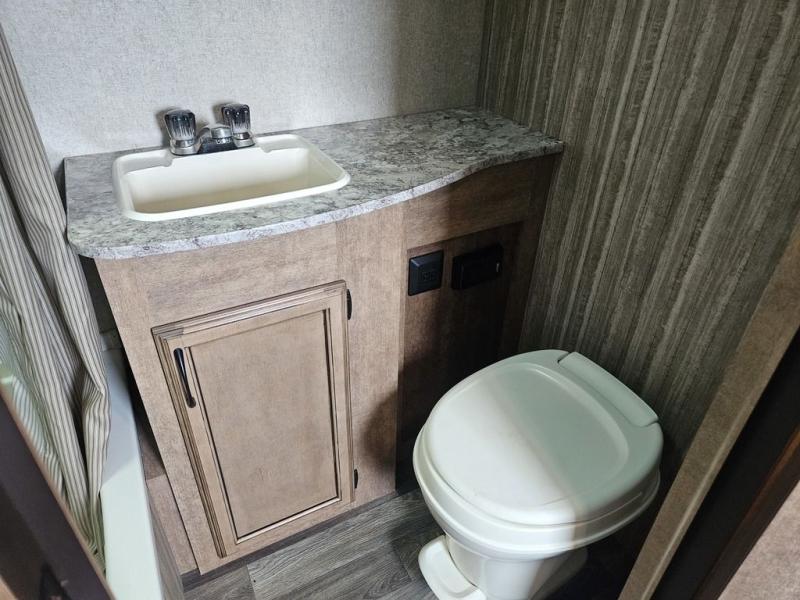 There is a booth dinette for dining in the rear, and a sofa opposite which makes a perfect conversation area. Both can be used for additional sleeping space if needed too. Choose a jack knife sofa in place of the standard sofa if you wish