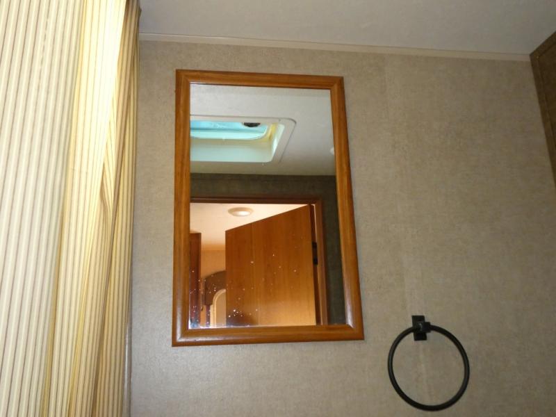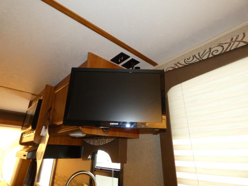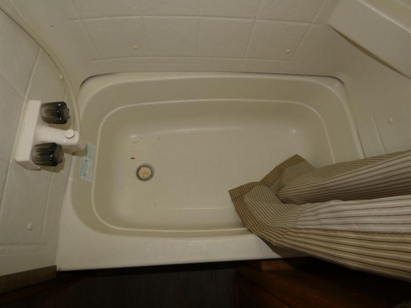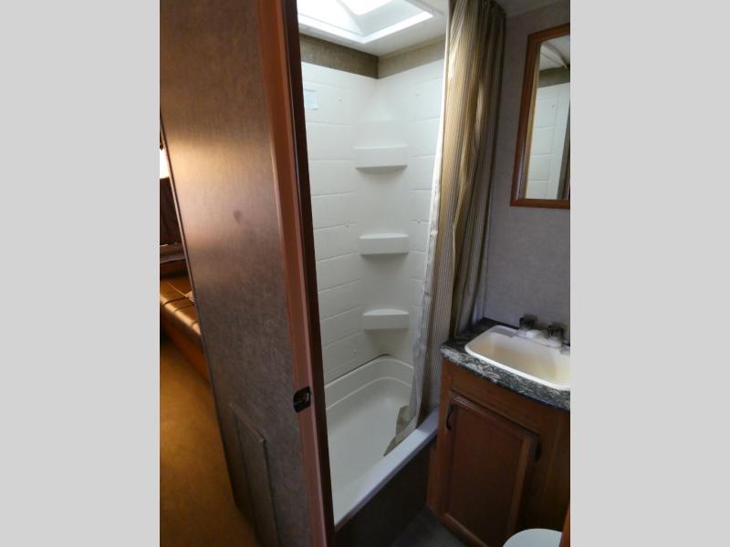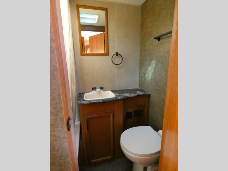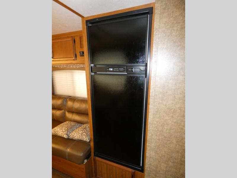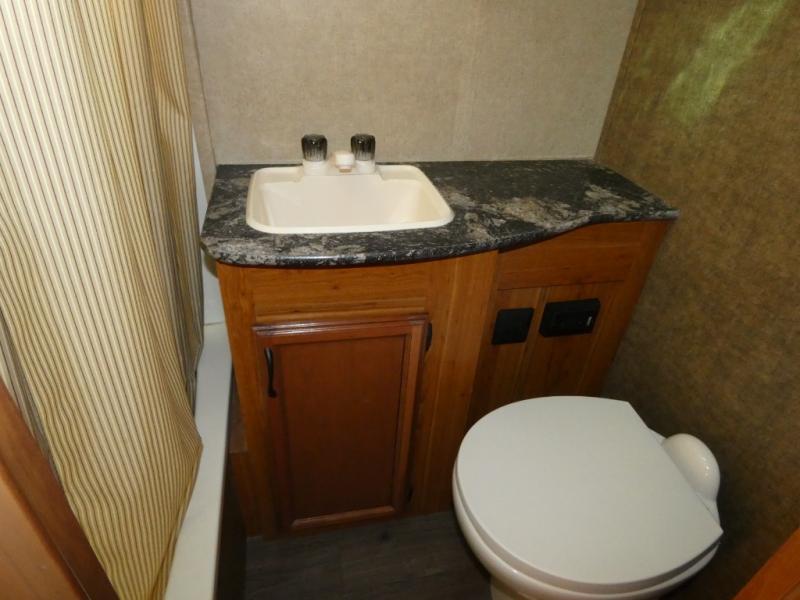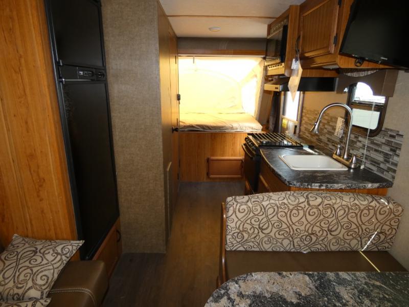 To the left of the door you will find a three burner range with microwave oven for cooking up light meals and snacks. There is a single sink for easy cleanup, and overhead cabinets for dishes and things. Opposite the sink is a refrigerator and furnace.