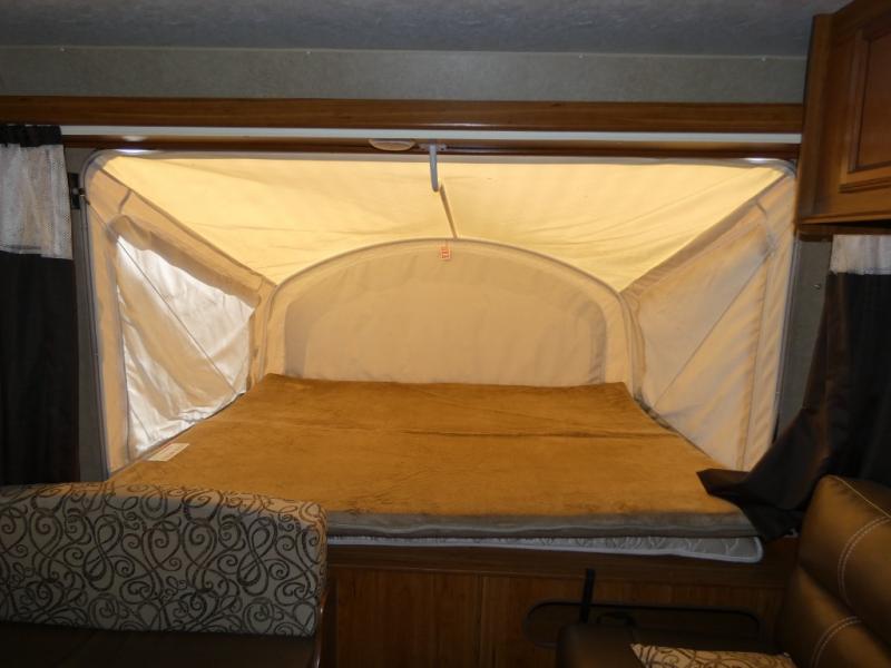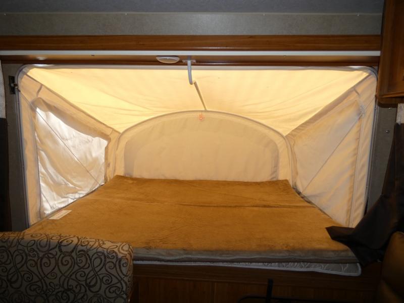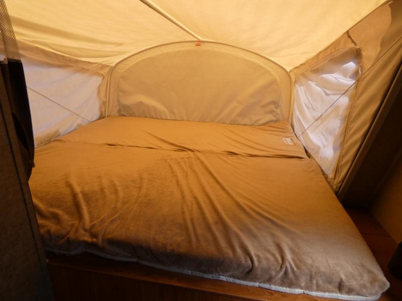 To the right is a large overhead shelf and a front king size expandable tent end bed for sleeping.