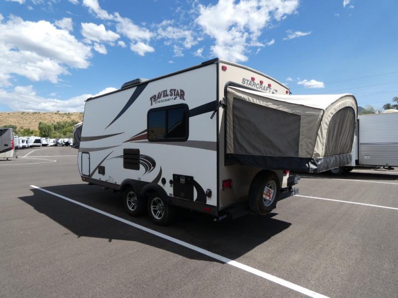This Starcraft Travel Star expandable 186RD features front king and rear queen tent end expandable bunks for sleeping, a rear dinette, and everything else you might need to take your camping experience up a notch!
