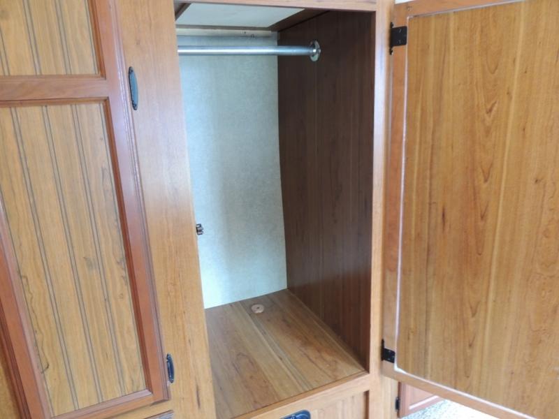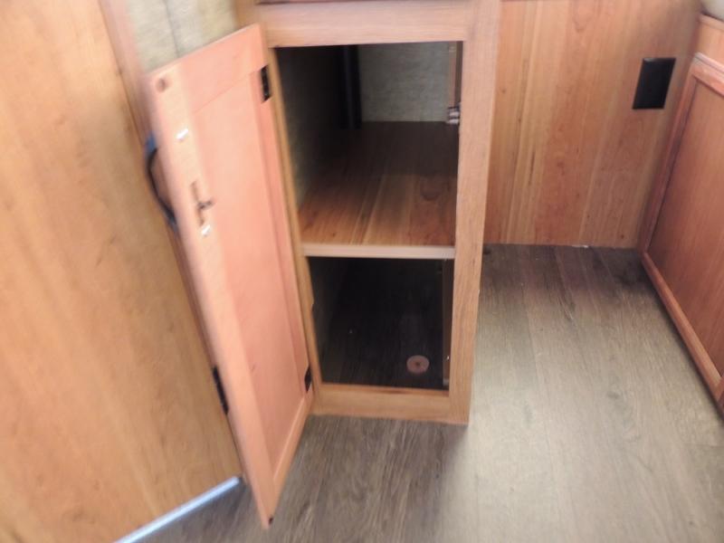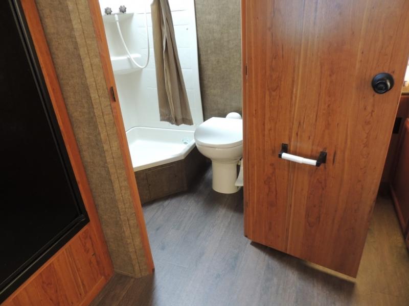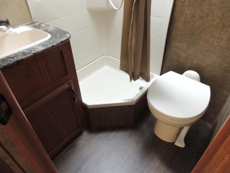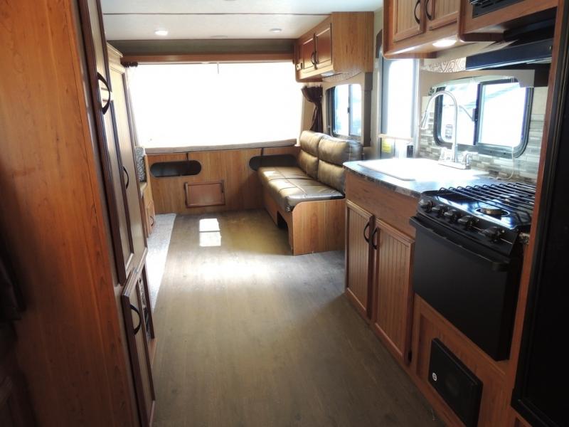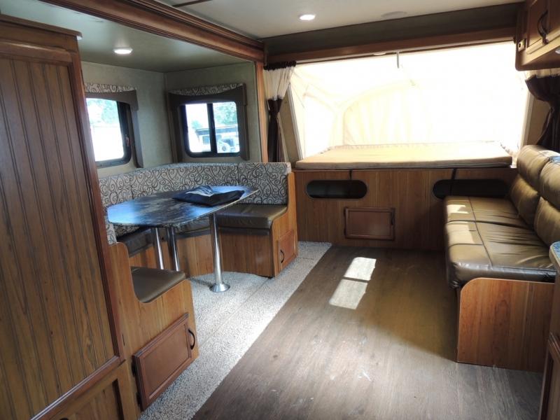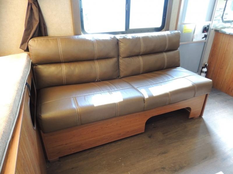 Step inside and find a sofa to your immediate right of the entry door. The front features an expandable tent end queen size bed with overhead shelf. There is also a slide out u-shaped dinette for meal times, and a wardrobe just off to the side of the slide for clothing storage. Above the wardrobe it is prepped for a TV if you choose to add.