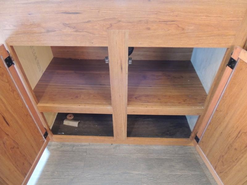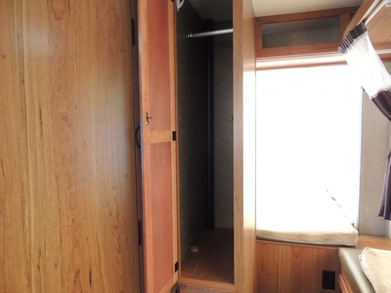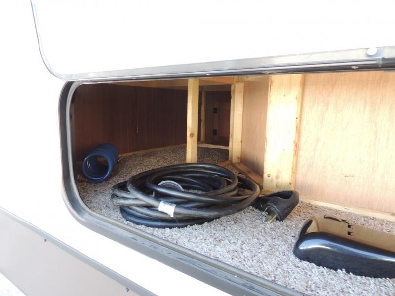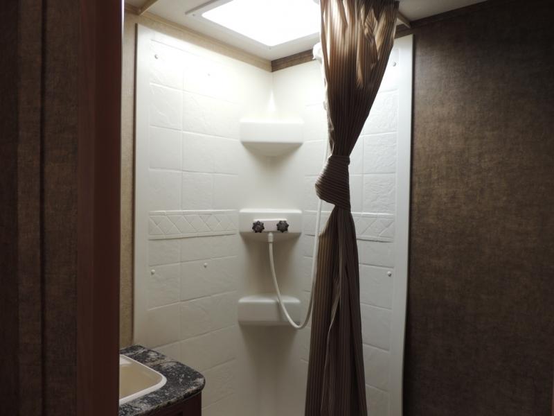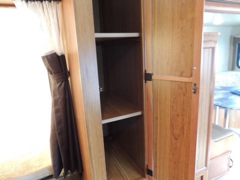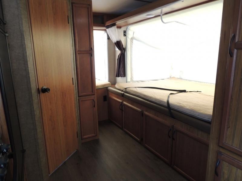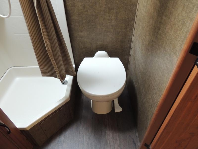 Step inside and find a sofa to your immediate right of the entry door. The front features an expandable tent end queen size bed with overhead shelf. There is also a slide out u-shaped dinette for meal times, and a wardrobe just off to the side of the slide for clothing storage. Above the wardrobe it is prepped for a TV if you choose to add.