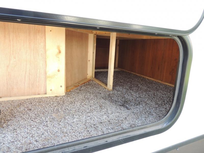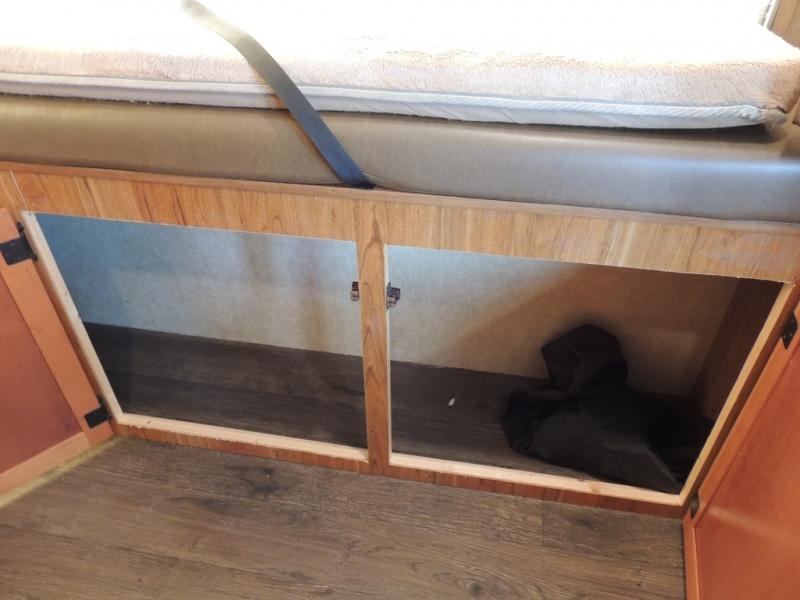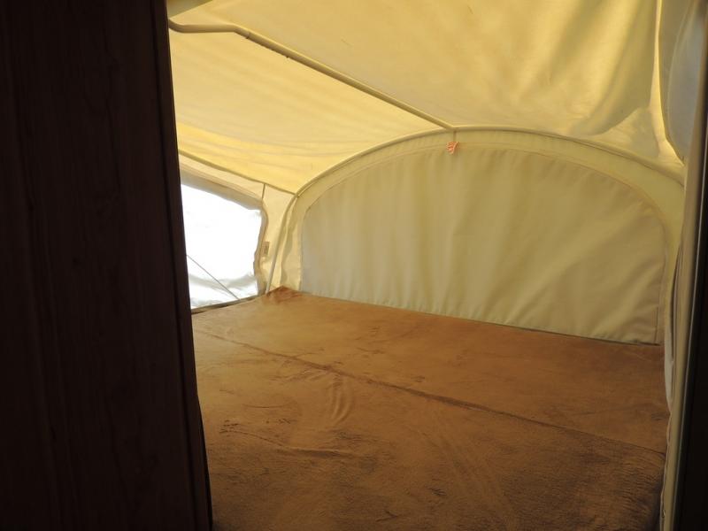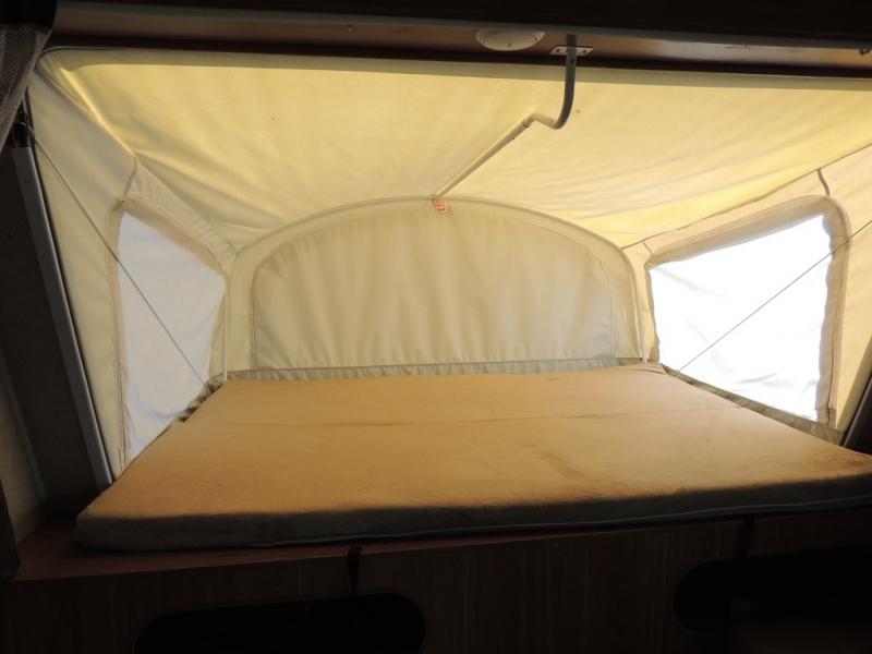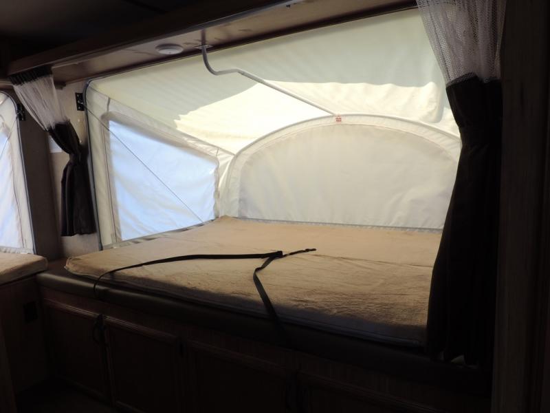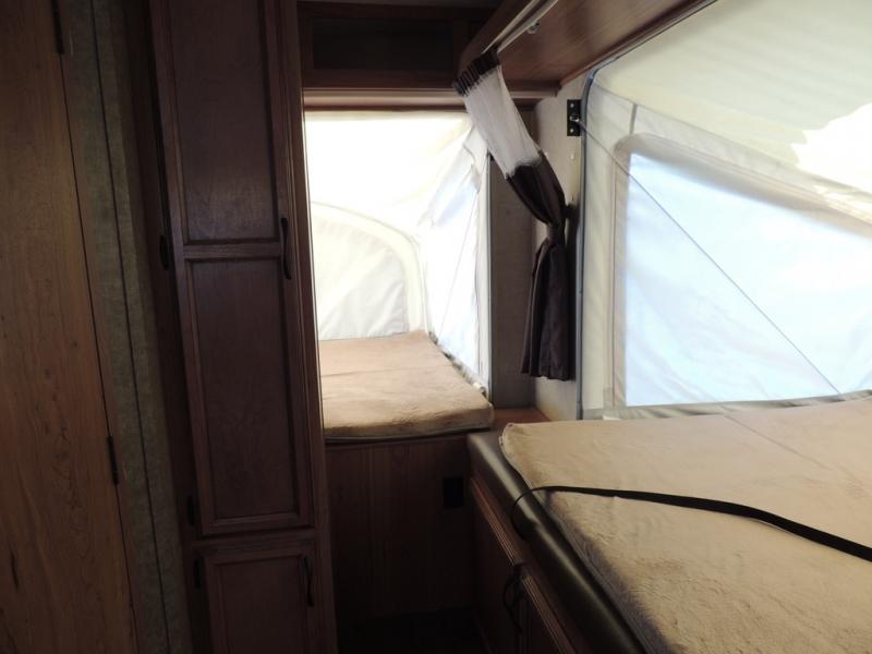 The rear and rear side also feature queen size tent end expandable beds for sleeping along with overhead cabinets above the side bed, and an overhead shelf along the back.