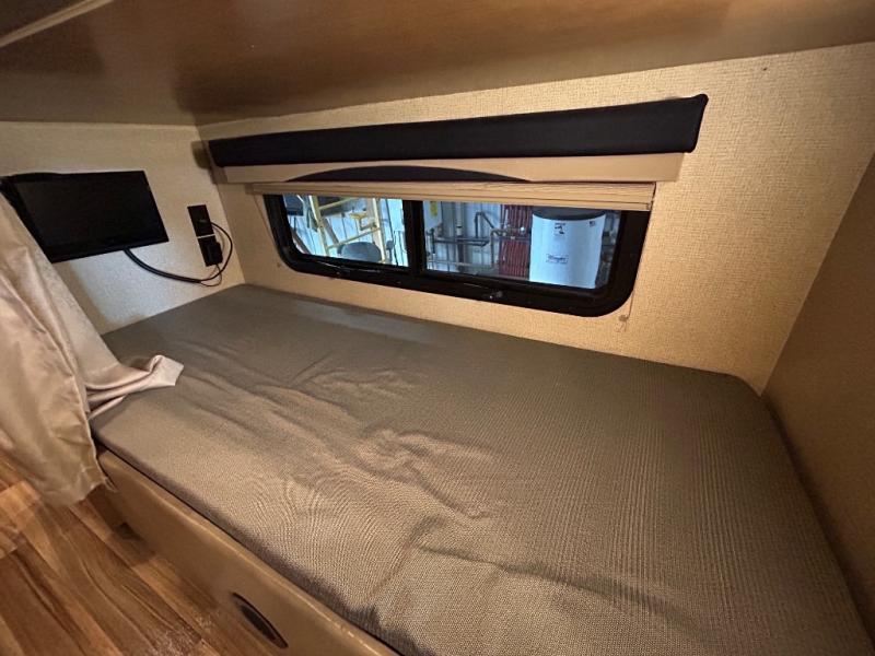Full Wall Slide-Queen Bedroom, Bunk Beds, Sleeper Sofa across from large TV, Dinette Booth (sleeper) and overcab bunk bed