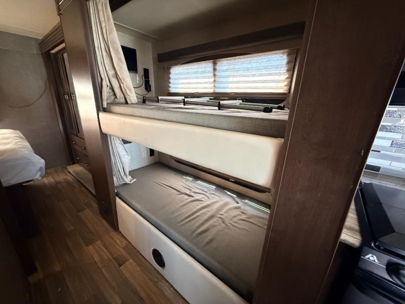 Before the bedroom you will find a set of 29" x 71" bunks on the right towards the middle of the full wall slide that the kids or grandkids are sure to love.