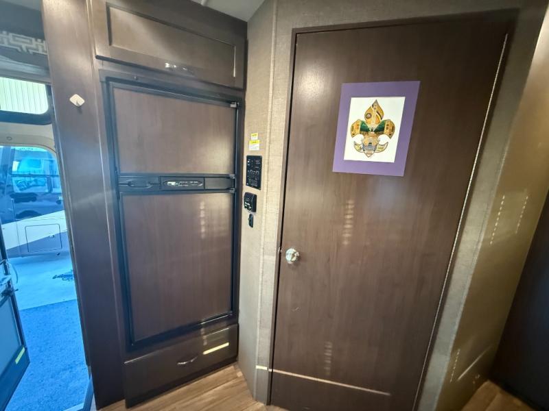 The kitchen amenities provide what you need to create meals and snacks on the go. There is a three burner range with microwave oven, a single kitchen sink, and overhead storage along with a refrigerator found on the opposite side. There is also a pull-out pantry for your non-perishables.