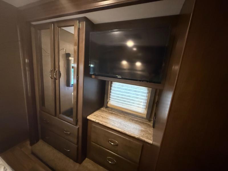 The rear bedroom features a queen bed with nightstands and overhead cabinets. There is also a closet and dresser along the full wall slide. Above the dresser there is a 32" LED TV for your enjoyment.
