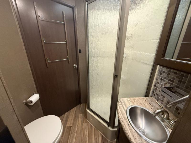 Heading towards the rear of the coach there is a full bath with angled shower, toilet and sink. The bath features dual entry doors to easily access from the living area, and from the rear bedroom too.