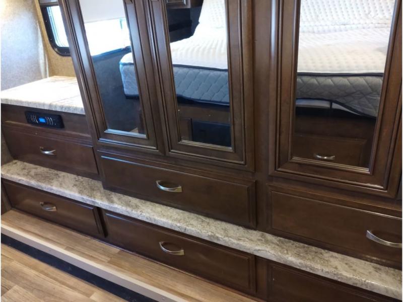 Enter just behind the front passenger seat and enjoy the space with dual slides in front fully expanded. There is a dream dinette with two sets of seat belts to your immediate left. Next, a double sink, a three burner range with overhead microwave oven, and a residential refrigerator and food pantry. Opposite find an always-in-view 40" LED TV and fireplace, plus a slide out L-shaped sofa. There is also a bunk above the cab area that drops down and provides sleeping for two.