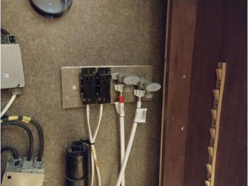 Mid-coach find a large side bath centrally located along the road side. The bath features a 36" x 30" shower, a toilet, and a vanity with dual sinks, plus a closet that has been prepped for a stackable washer and dryer, if you choose to add that. Both of the sink and the closet are within the third slide out.