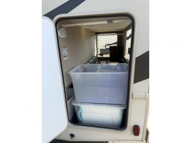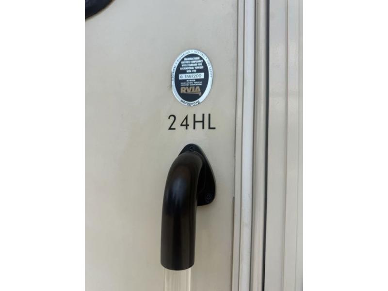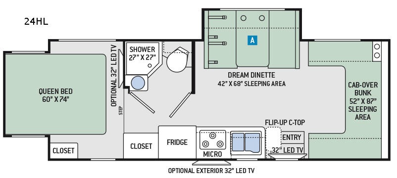 Step inside model 24HL and notice the slide out Dream Dinette straight ahead. There is a 32" LED TV above the door opposite the dinette for perfect viewing. You will find two sets of seat belts for rear travelers here, and overhead storage for your things. At night if you need the extra sleeping space you can easily convert the dinette for one adult or two children with a 42" x 68" sleeping area. There is storage beneath both bench seats where you can easily keep blankets and pillows tucked away. There is also a cab-over bunk that features a 52" x 87" sleeping area as well.