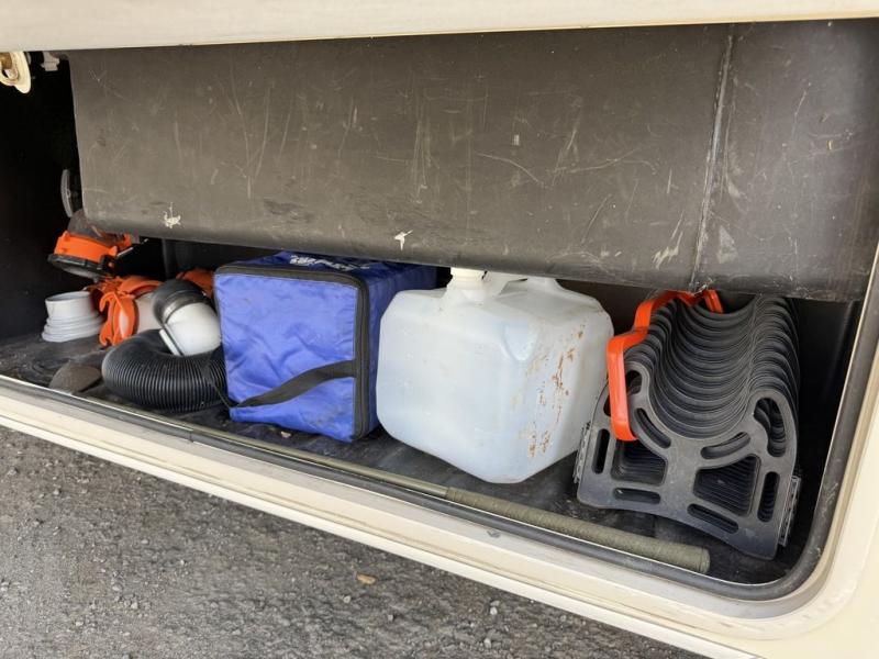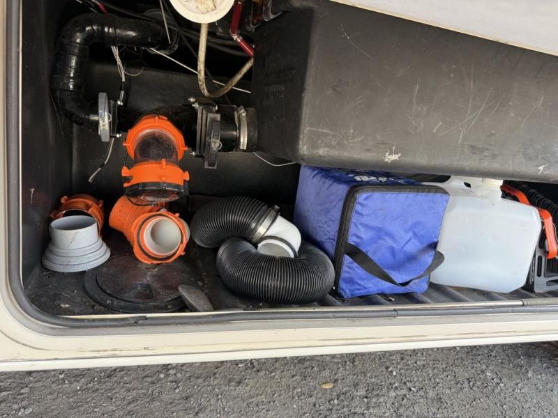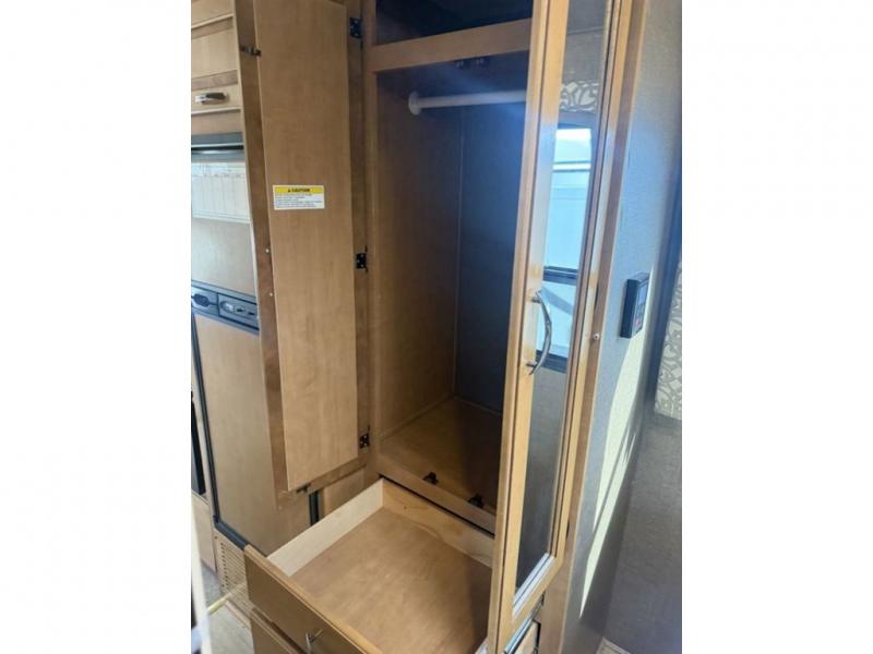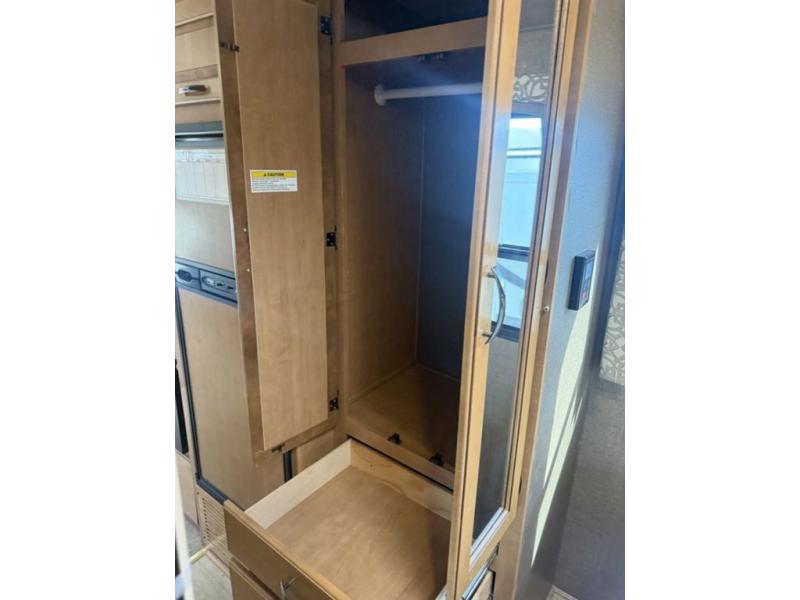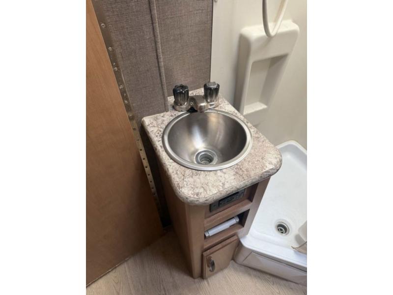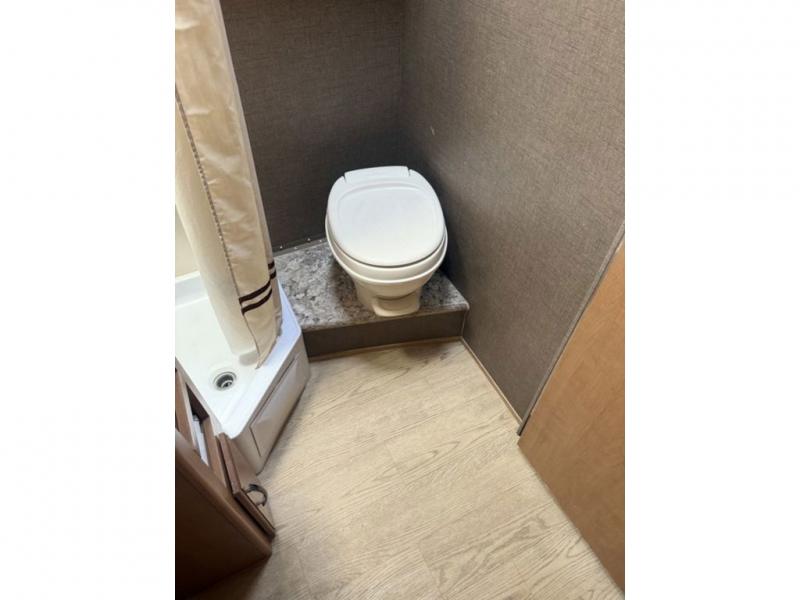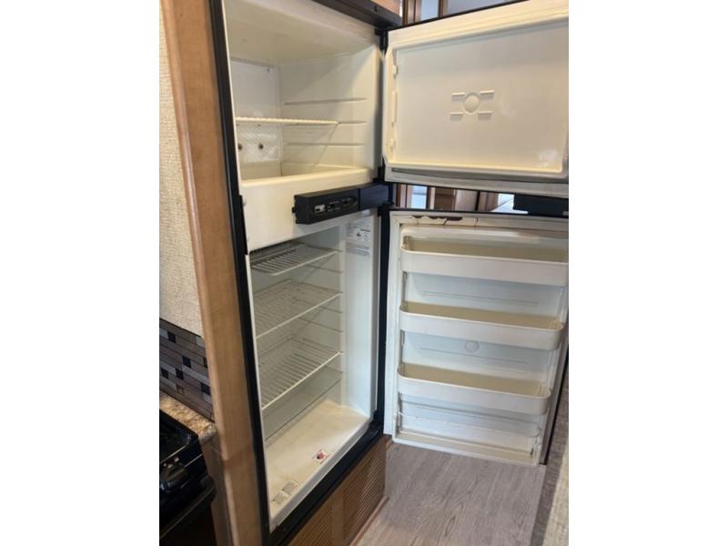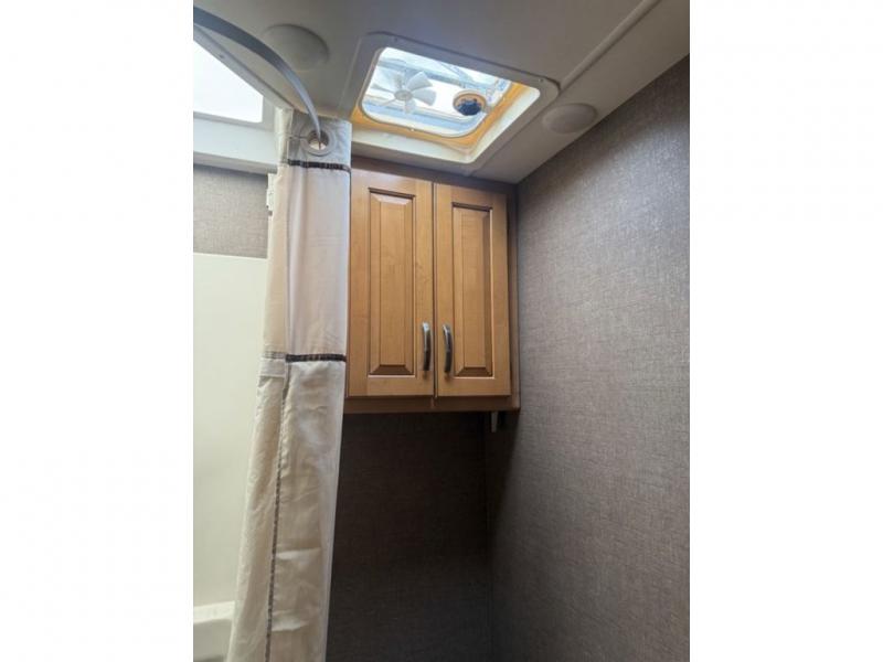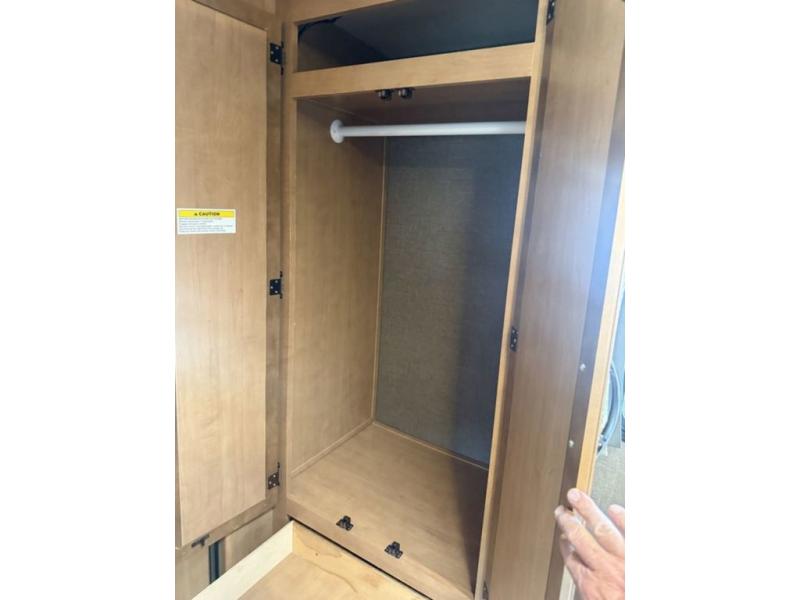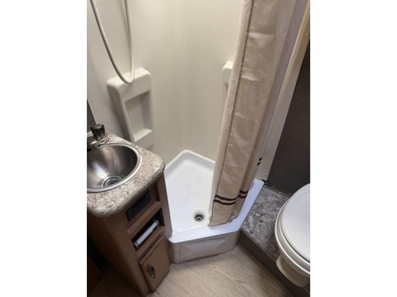Continue on toward the rear and find a bathroom along the road side that provides a 27" x 27" shower, toilet, and small sink. Opposite the bathroom next to the refrigerator is a closet for your clothing and/or linens.