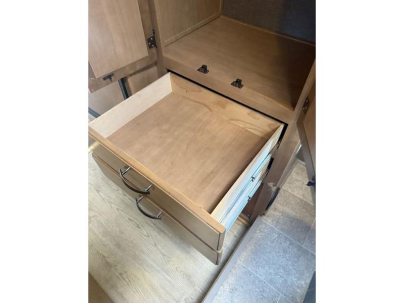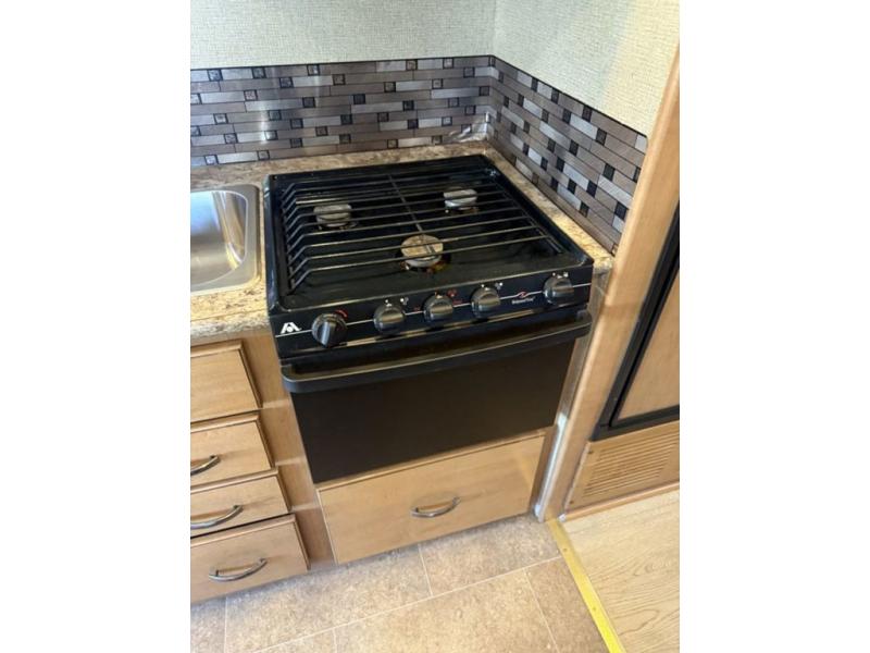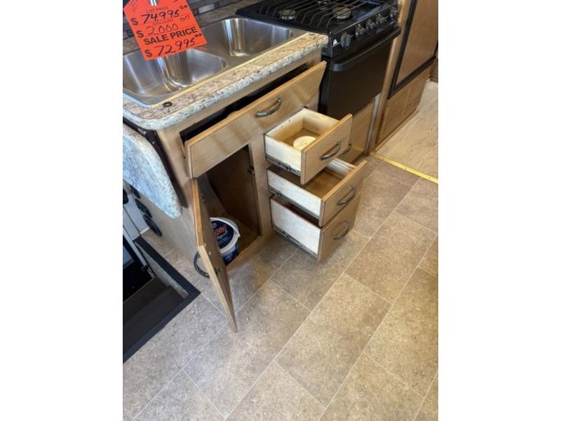 To the left of the entry door enjoy cooking up your camp favorites using the three burner range and overhead microwave oven. There is a refrigerator, a double sink, and a flip-up counter-top to provide even more space for food prep, and ample storage in overhead cabinets, plus drawer space too.
