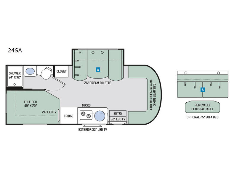 A Dream dinette with overhead cabinets for storage fills the motor homes single slide. This dinette can be converted for extra sleeping space measuring 42" x 72". You can choose to replace the dinette with the optional sofa with air bed measuring 54" x 74" with pedestal table. Someone can even get a good night's rest in the bunk over the cab.