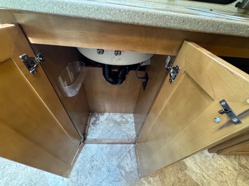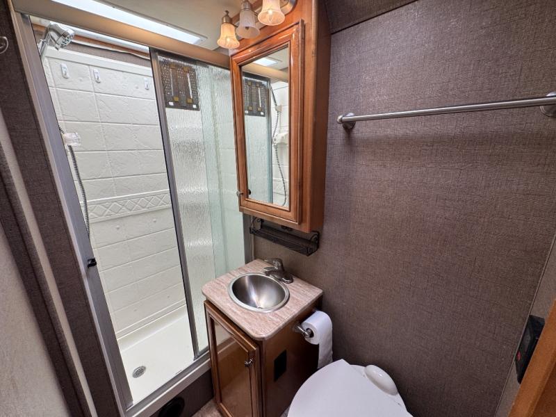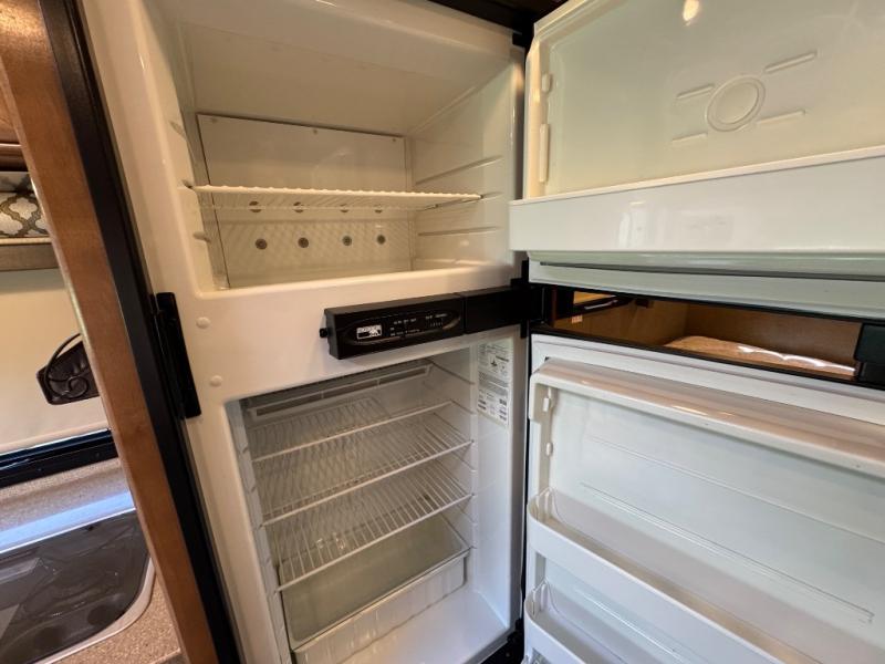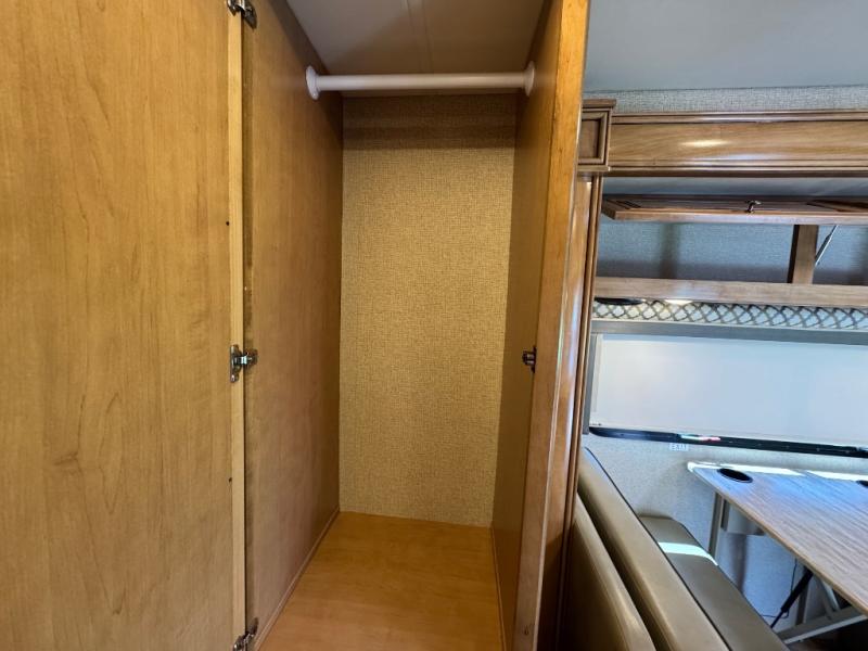 In the rear of the Citation Sprinter 24SA you will find a corner bathroom including a shower, vanity sink, medicine cabinet, and a toilet. There is a closet just outside the bath. The opposite rear corner holds a full size bed with overhead cabinets and a 24" LED TV for your enjoyment.