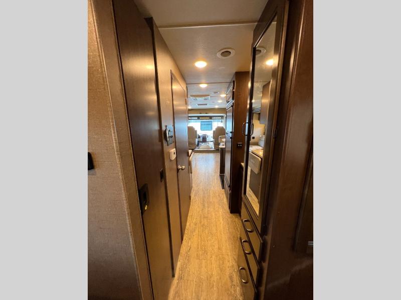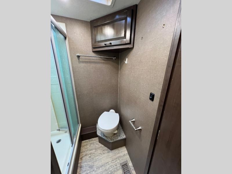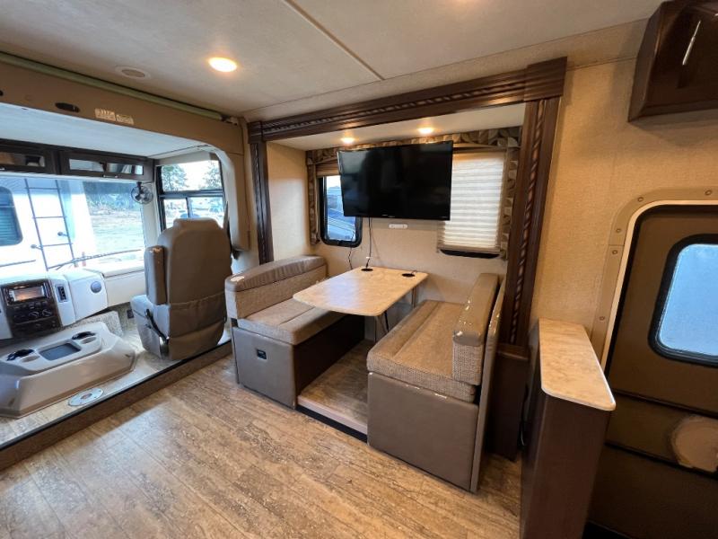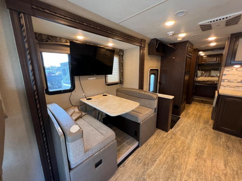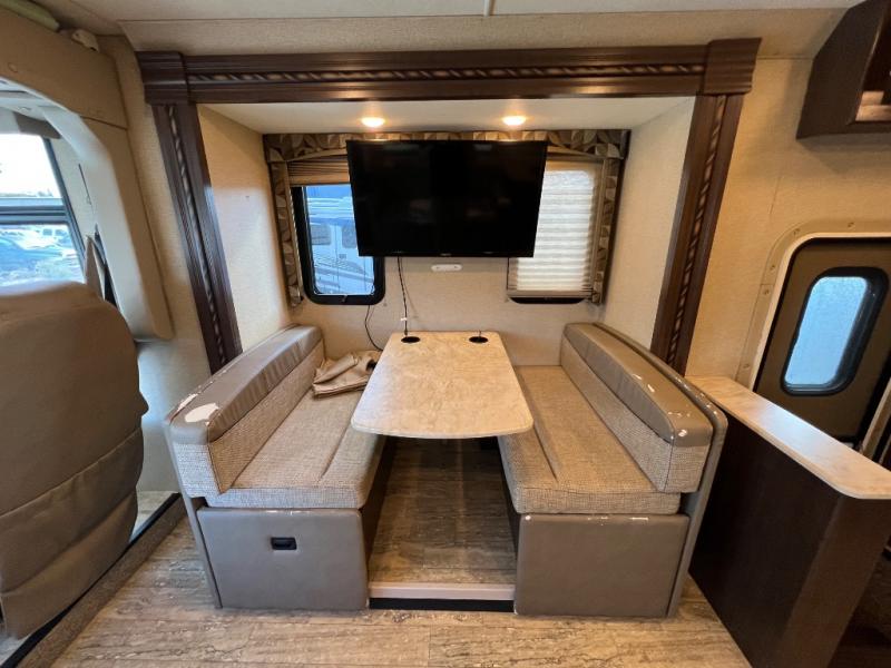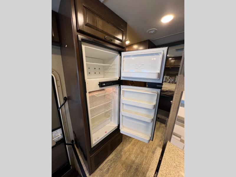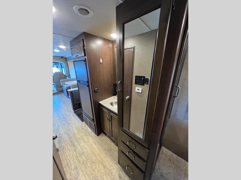 As you enter this model you will love how open and spacious the front of the motor home feels. Along the door side there is a dream dinette slide out with a 40" LED TV above. Enjoy your meals during the day around the dinette, and at night convert the dinette into additional sleeping space. Along the road side the slide out features a sofa bed with an overhead cabinet, a three burner range, and an overhead microwave. Straight in from the door you will find the double sink, an overhead cabinet, and a flip-up counter top. To the left of door there is a refrigerator for all of your perishable items.