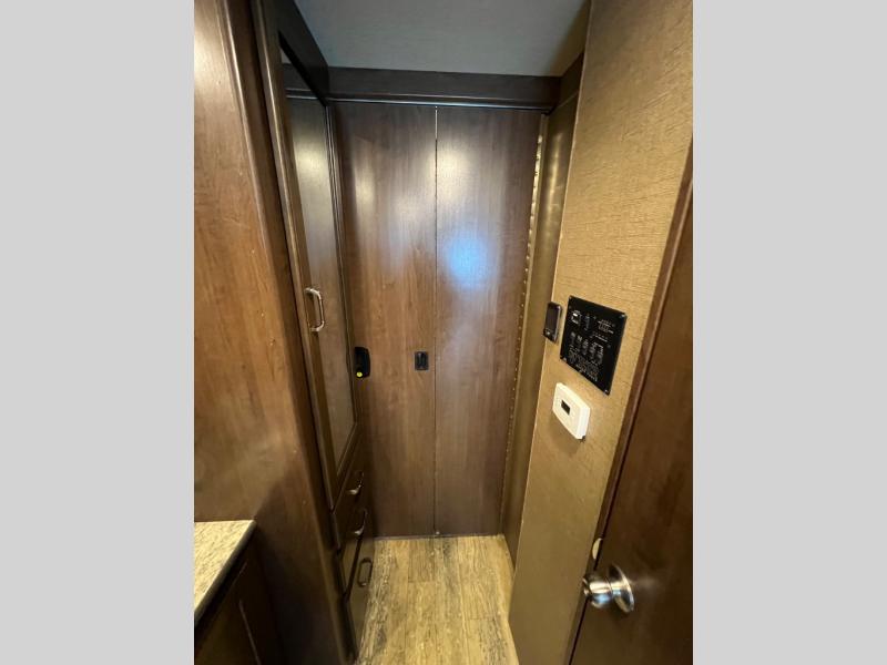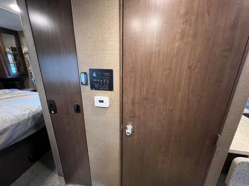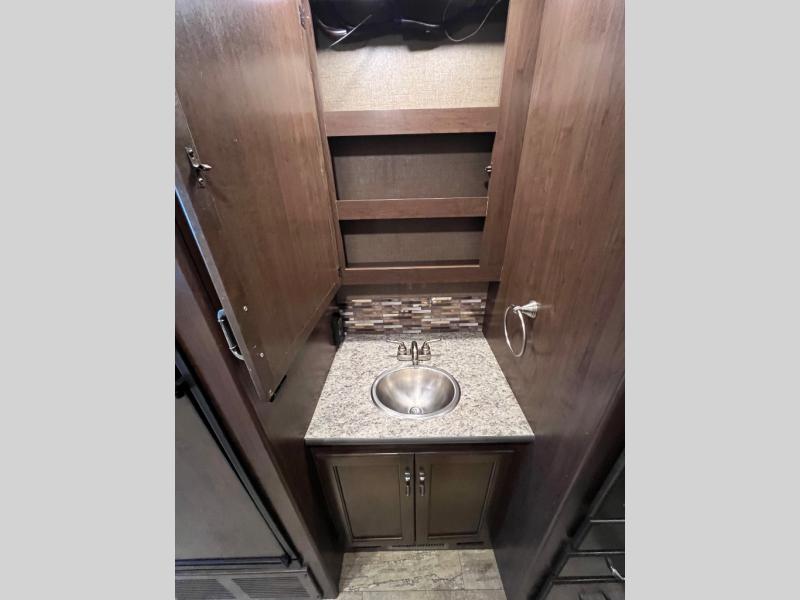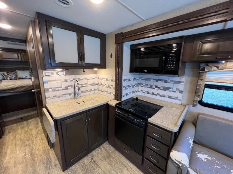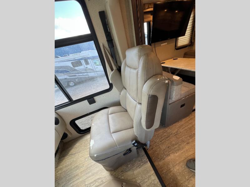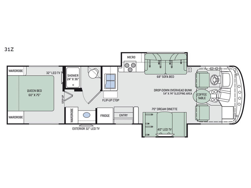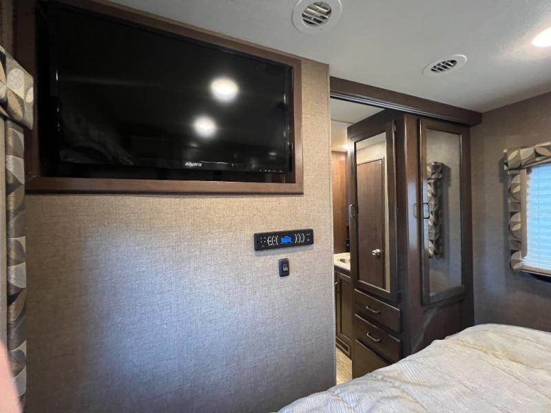 As you enter this model you will love how open and spacious the front of the motor home feels. Along the door side there is a dream dinette slide out with a 40" LED TV above. Enjoy your meals during the day around the dinette, and at night convert the dinette into additional sleeping space. Along the road side the slide out features a sofa bed with an overhead cabinet, a three burner range, and an overhead microwave. Straight in from the door you will find the double sink, an overhead cabinet, and a flip-up counter top. To the left of door there is a refrigerator for all of your perishable items.