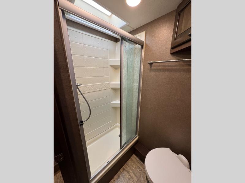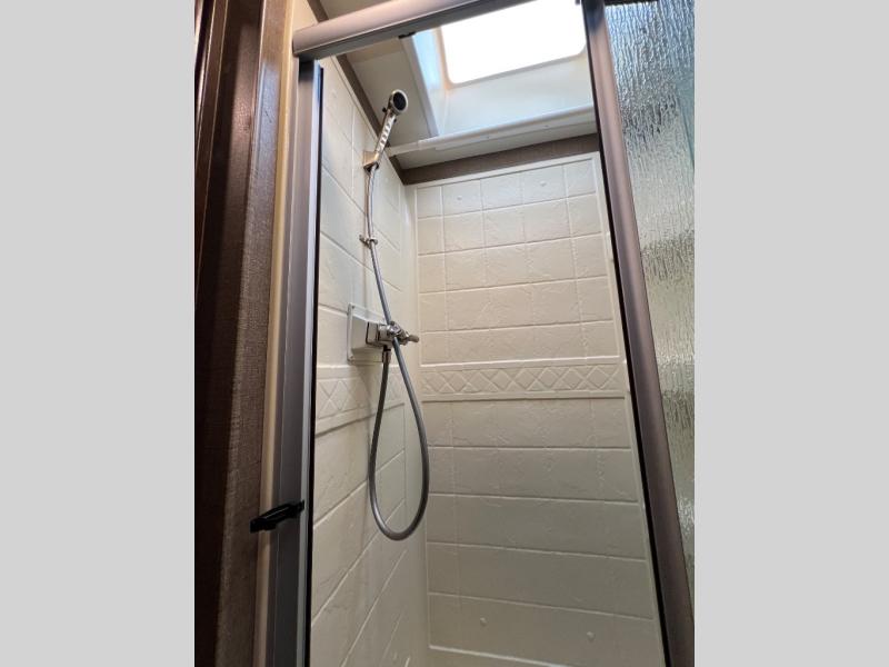 Heading toward the rear of this motor home, you will find a private toilet area with a 24" x 36" shower along the road side. The sink, medicine cabinet, and wardrobe are across the hall along the door side.