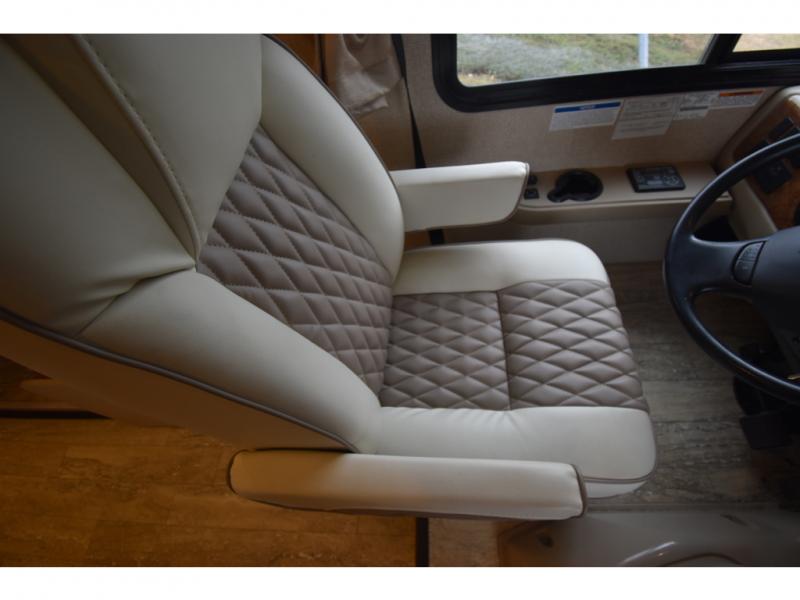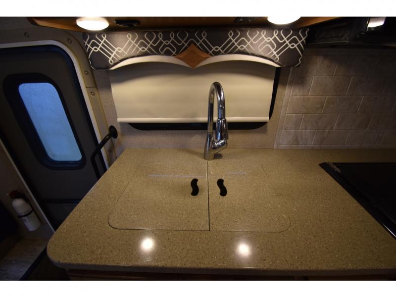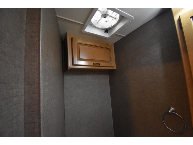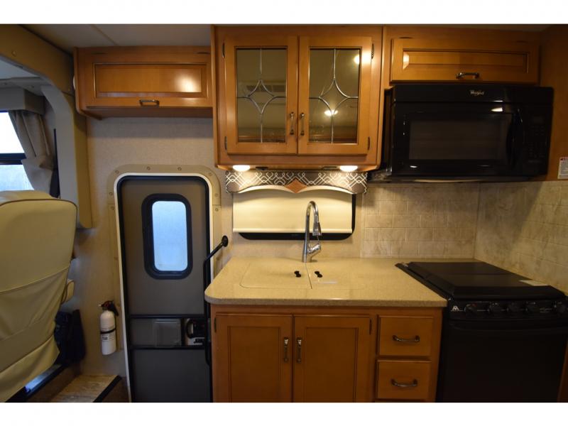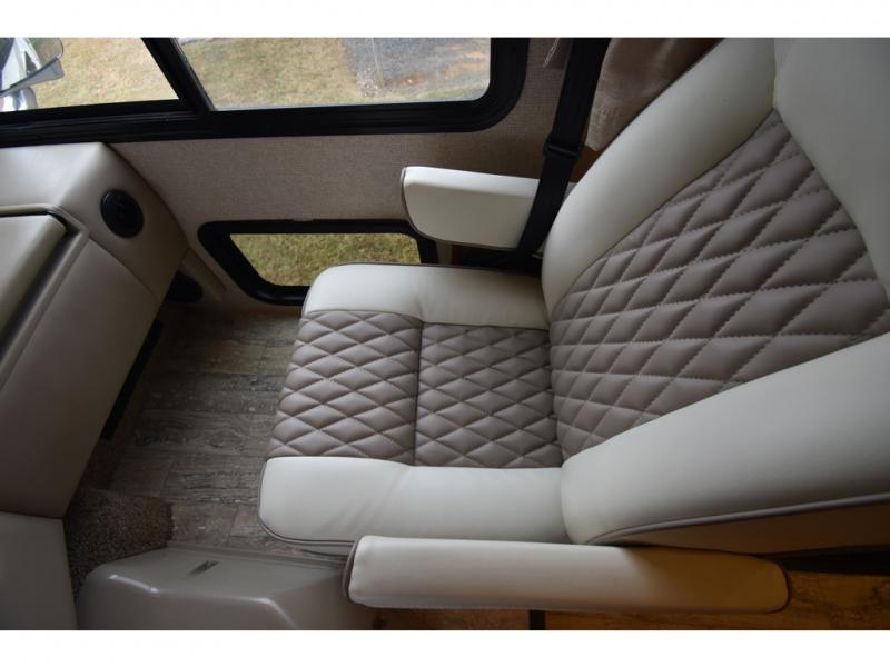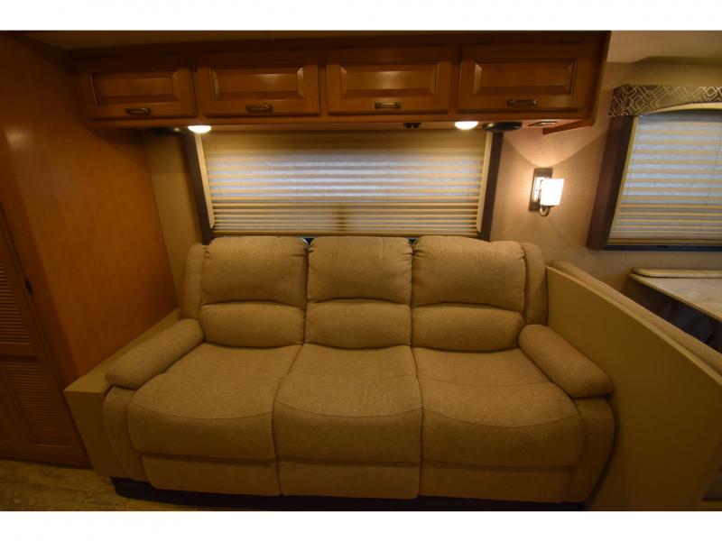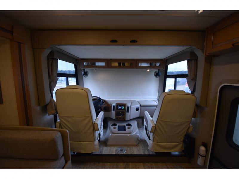 Across the front, you may use the drop-down overhead bunk above the cab area for additional sleeping space. A coffee table is in between the two captain's chairs for additional eating or table top space.