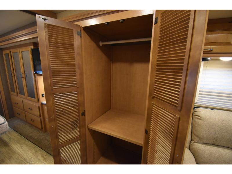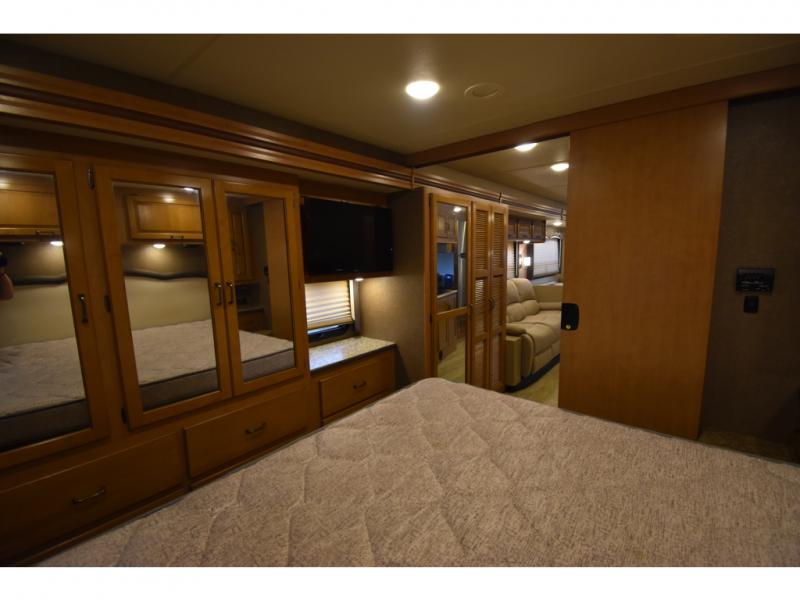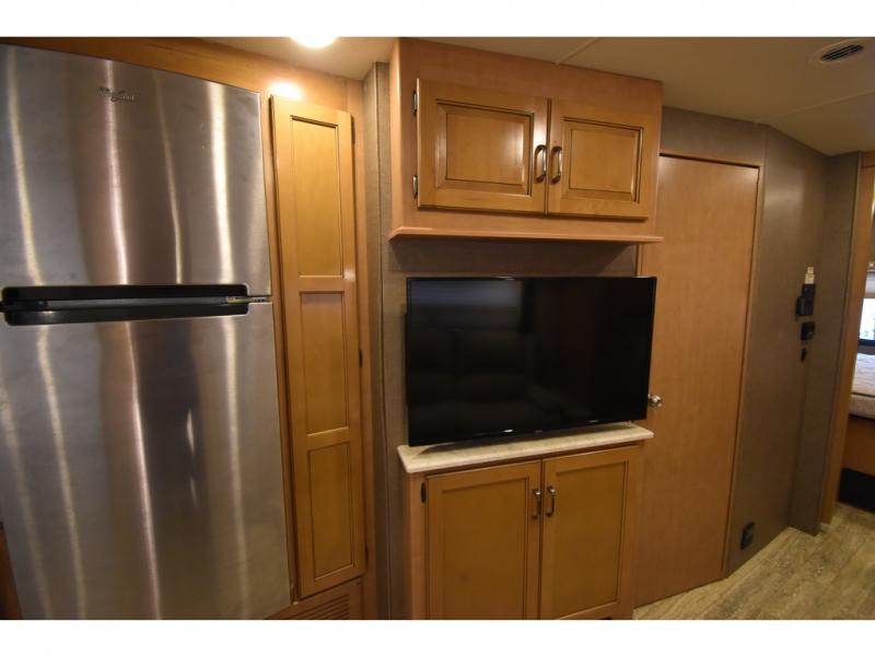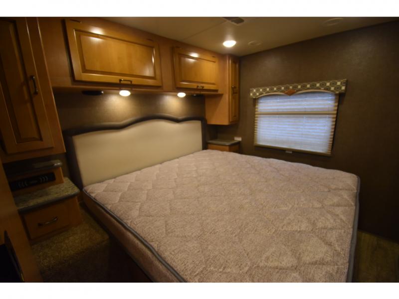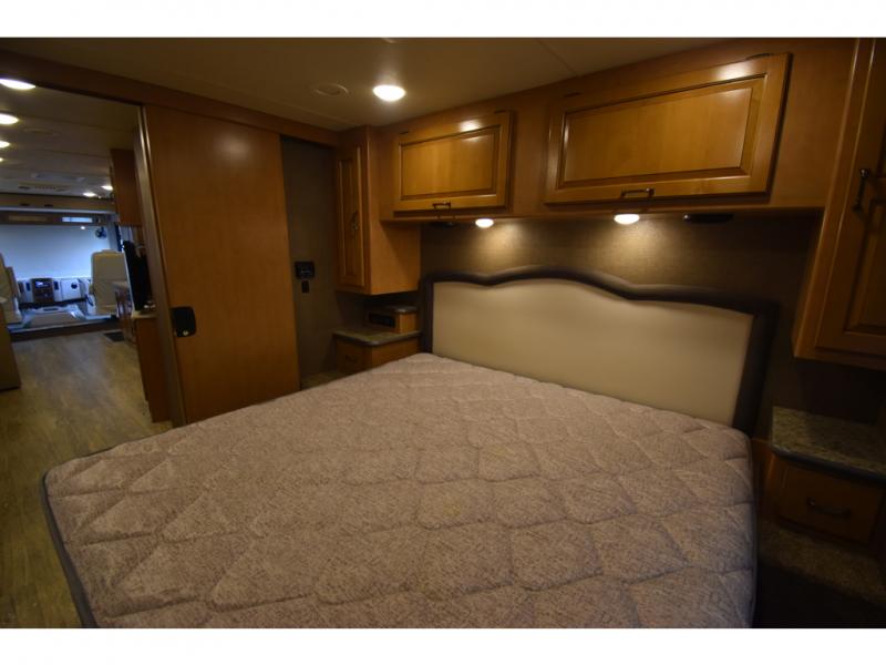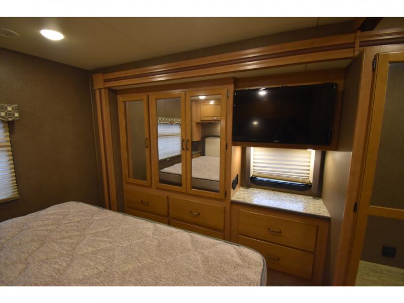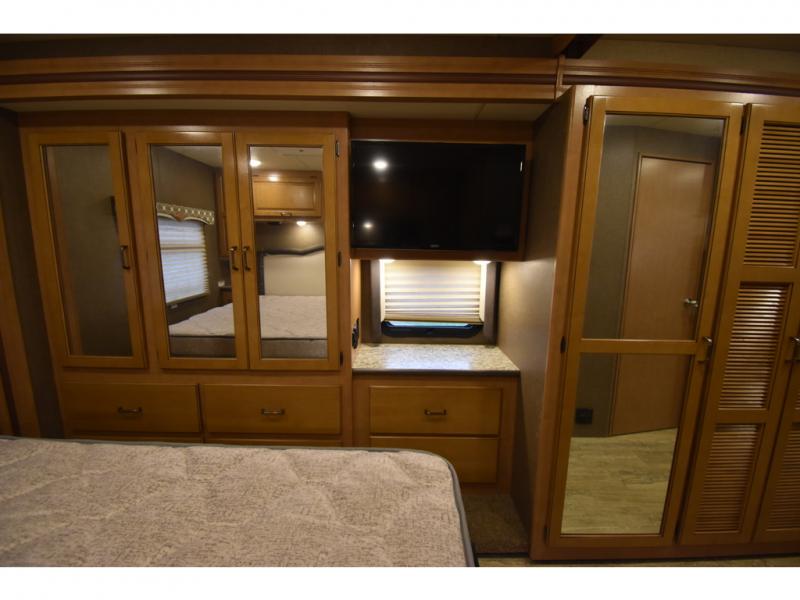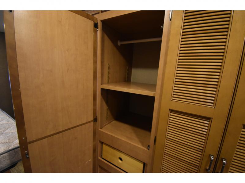 Continuing into the rear bedroom, the slide out offers an additional wardrobe, and a dresser with a 32" LED TV. The bedroom also includes a king size bed with nightstands on each side and overhead storage above the head of the bed.