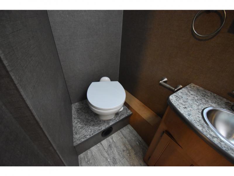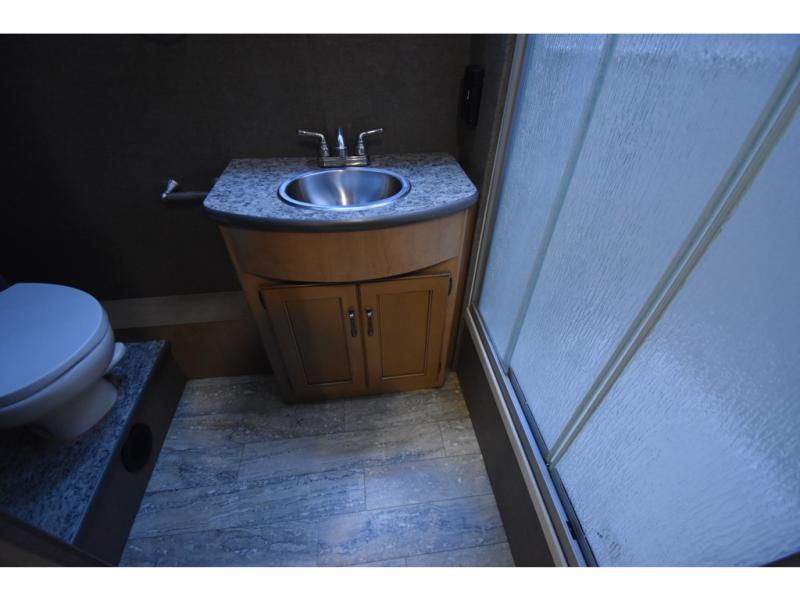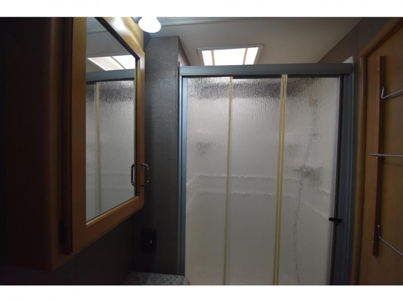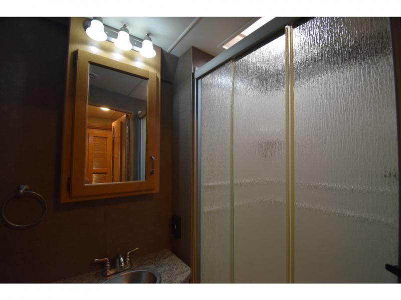Along the curbside, a side aisle bathroom includes a 30" x 36" shower, vanity sink, medicine cabinet, toilet, and linen storage.