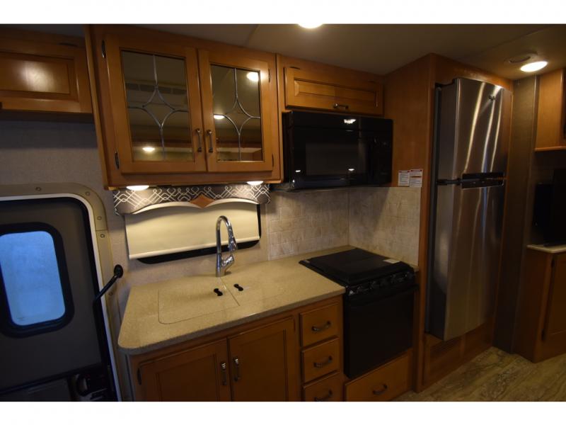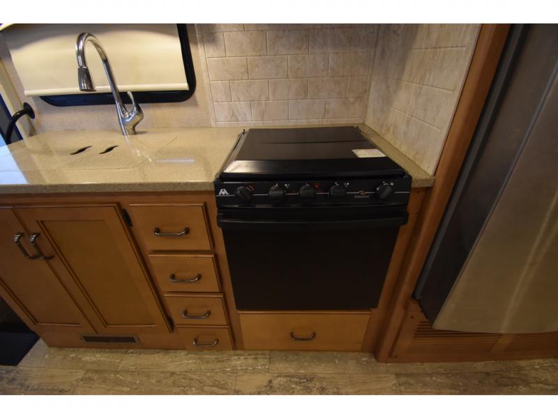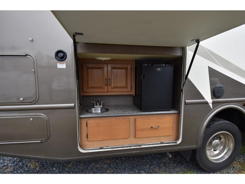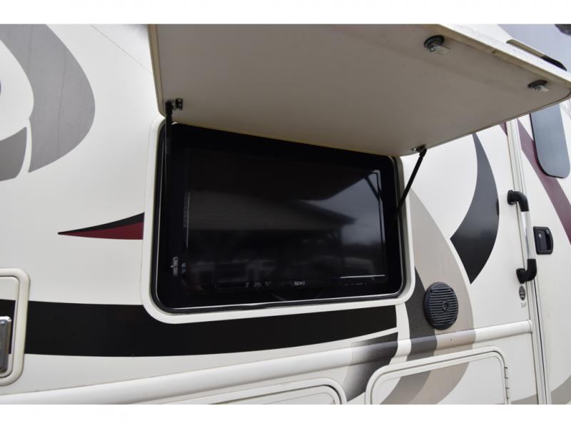 If you enjoy cooking in the great outdoors, the exterior kitchen includes a 2.6 cu. ft. refrigerator, sink, and portable gas grill, plus there is much more to enjoy outside like the exterior 32" LED TV and inside this coach!