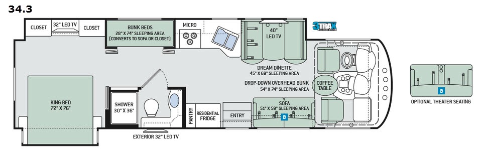 Across from the sofa you will find the full wall slide starting with a dream dinette featuring a 45" x 69" sleeping area when prepared with a 40" LED TV above, an angled double kitchen sink, and three burner range with microwave oven. Next there is a set of bunks that converts to a sofa or a closet with dividers to close off the area for more privacy. Plus in the bedroom there are dual closets with a 32" LED TV between the closets to complete the full road side wall slide out.
