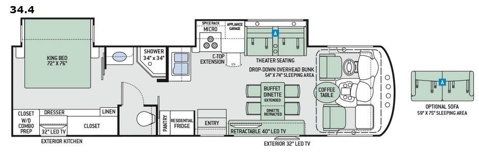 As you enter you will find a slide out including theater seating for two, countertop extension, appliance garage, spice rack, microwave oven, and a three burner range. You can choose an optional sofa in place of the theater seating which would allow more sleeping area. The kitchen sink is on the interior wall. Across from this space there is a pantry, a residential refrigerator, buffet dinette with extension and four chairs, plus a retractable 40" LED TV. Over the cab you will find an extra sleeping space your guests will enjoy. The drop-down overhead bunk measurements are 54" x 74". There is a coffee table between the two cab chairs that you can enjoy as well.