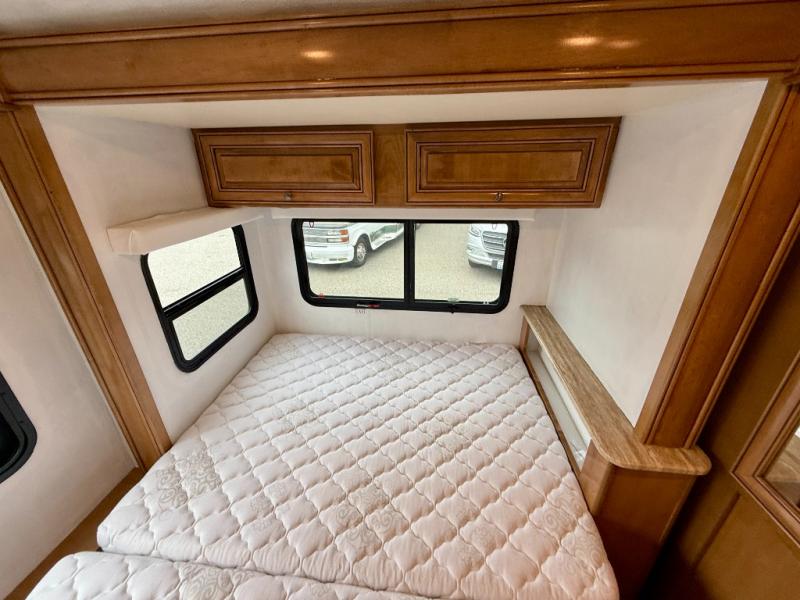 Model 24SS offers double slides, a rear corner bath, and cab-over bunk for an added 36" x 75" sleeping space. Enter just behind the front passenger seat and notice the 32" LED TV overhead. To your immediate left there is a kitchenette that will allow you to easily make meals and snacks on the road. There is a round single sink, some counter space, and a two burner range top, plus overhead microwave oven. There is also a refrigerator for your perishables.