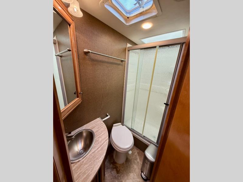 A rear corner bath features a 24" x 32" shower, toilet, and vanity with sink, plus overhead medicine cabinet. The opposite corner features a queen size bed slide out on the road side plus a nightstand and more overhead cabinets. There is a 32" LED TV, and more.