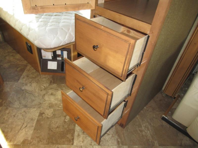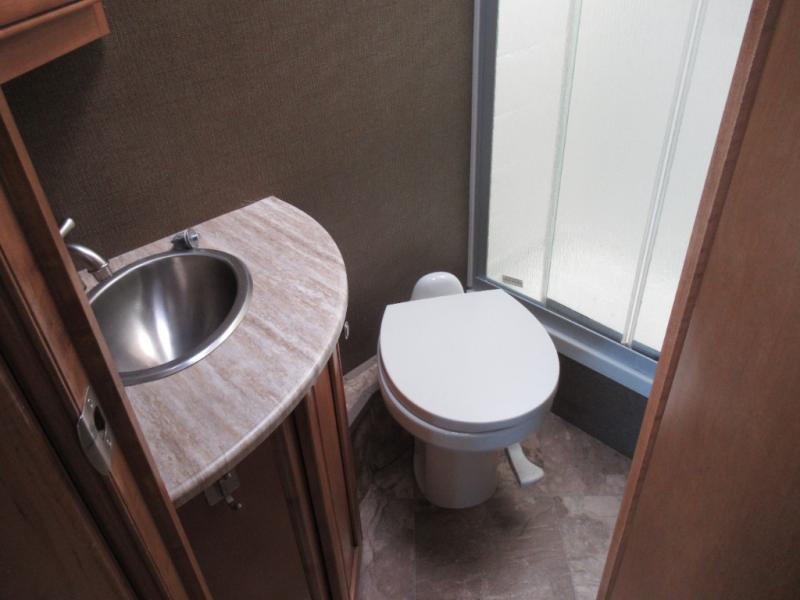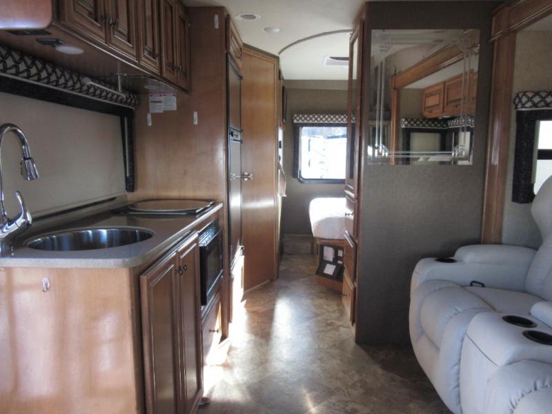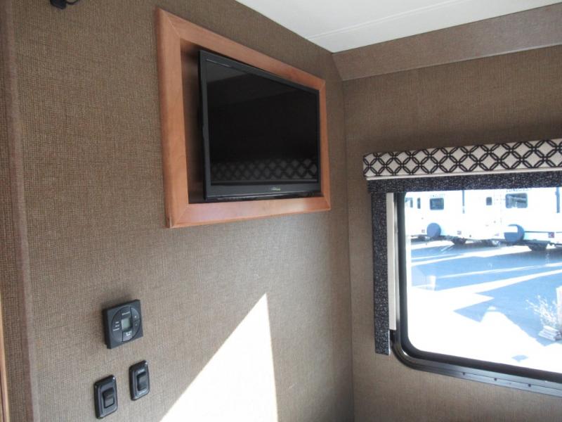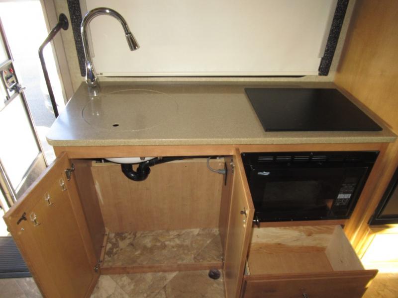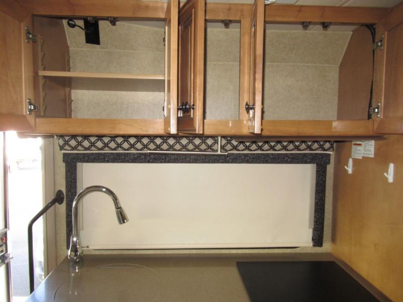 Model 24SS offers double slides, a rear corner bath, and cab-over bunk for an added 36" x 75" sleeping space. Enter just behind the front passenger seat and notice the 32" LED TV overhead. To your immediate left there is a kitchenette that will allow you to easily make meals and snacks on the road. There is a round single sink, some counter space, and a two burner range top, plus overhead microwave oven. There is also a refrigerator for your perishables.