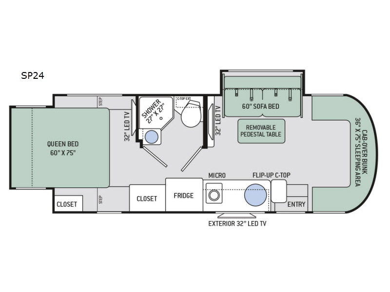 As you enter this model, above the cab you will find a 36" x 75" sleeping space for one adult or a child. The slide out located behind the driver's seat has a sofa bed and a removable pedestal table. At night the sofa converts into additional sleeping space. Adjacent to the slide you can enjoy watching movies at the 32" LED TV.