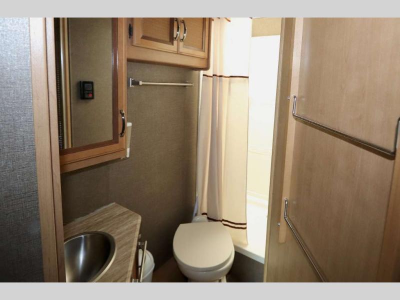 A rear private corner bathroom includes a shower, a toilet, sink, and overhead cabinets. You will love the convenience of your own on board bath!