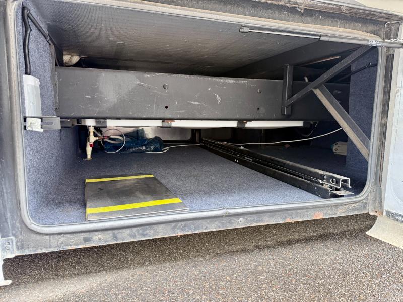 The rear bedroom features a slide out with a queen bed, nightstands, and an overhead cabinet along the road side. Across from the bed you will find a bank of drawers, and a TV. Along the rear wall there is a wardrobe which runs the width of the motor home. Here you will find plenty of storage space for all of your hang up clothes.