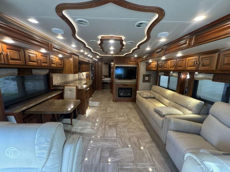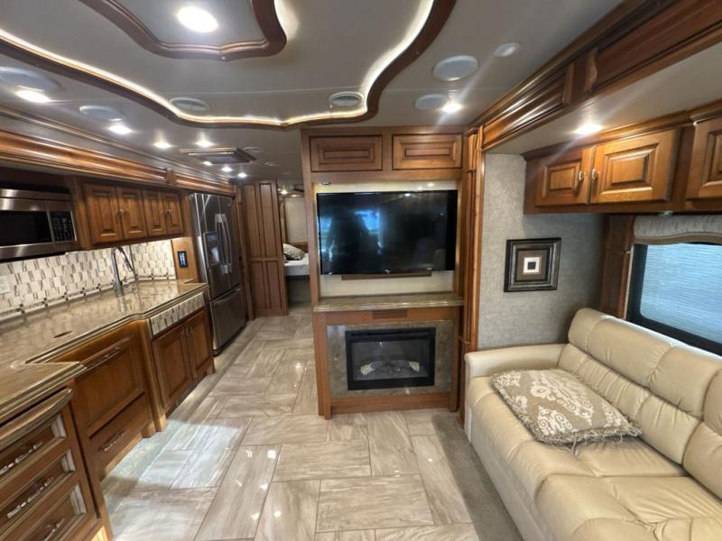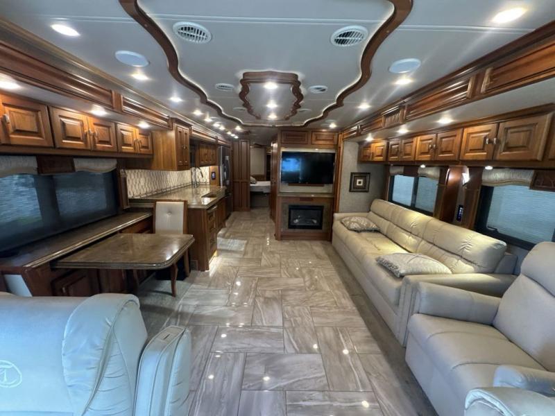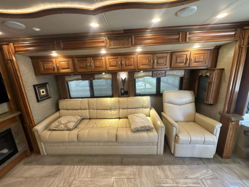 Along the road side there is a slide out sofa bed with ottoman, plus a recliner behind the driver's seat. There is also overhead storage to help keep things neat and organized. A TV and fireplace can be found along the interior wall.