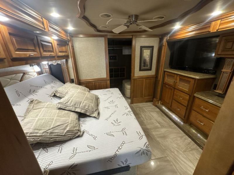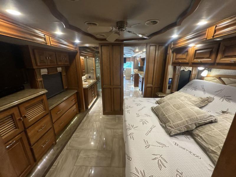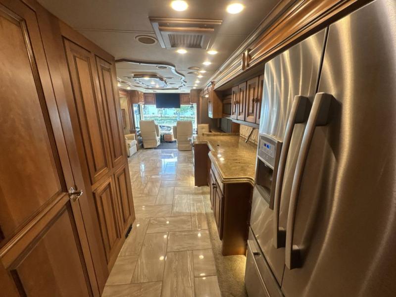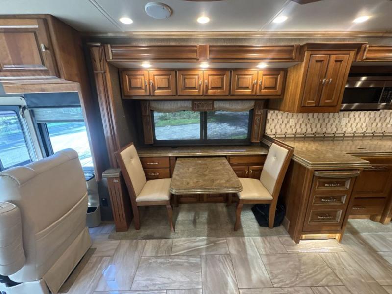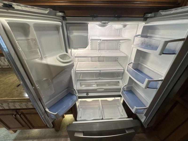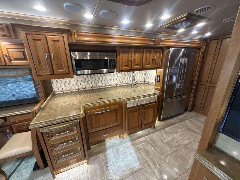 On the inside enjoy dual opposing slide outs in the main kitchen and living space, as well as in the master bedroom and bath area. Just behind the driver and passenger chair you find a dinette with computer work station on the left, plus the kitchen area to follow. Here you will enjoy counter space, a stove-top and range with overhead microwave oven, plus an optional drawer type dishwasher for added convenience. There is also a double sink, a residential refrigerator, pantry, plus ample overhead storage for dishes.